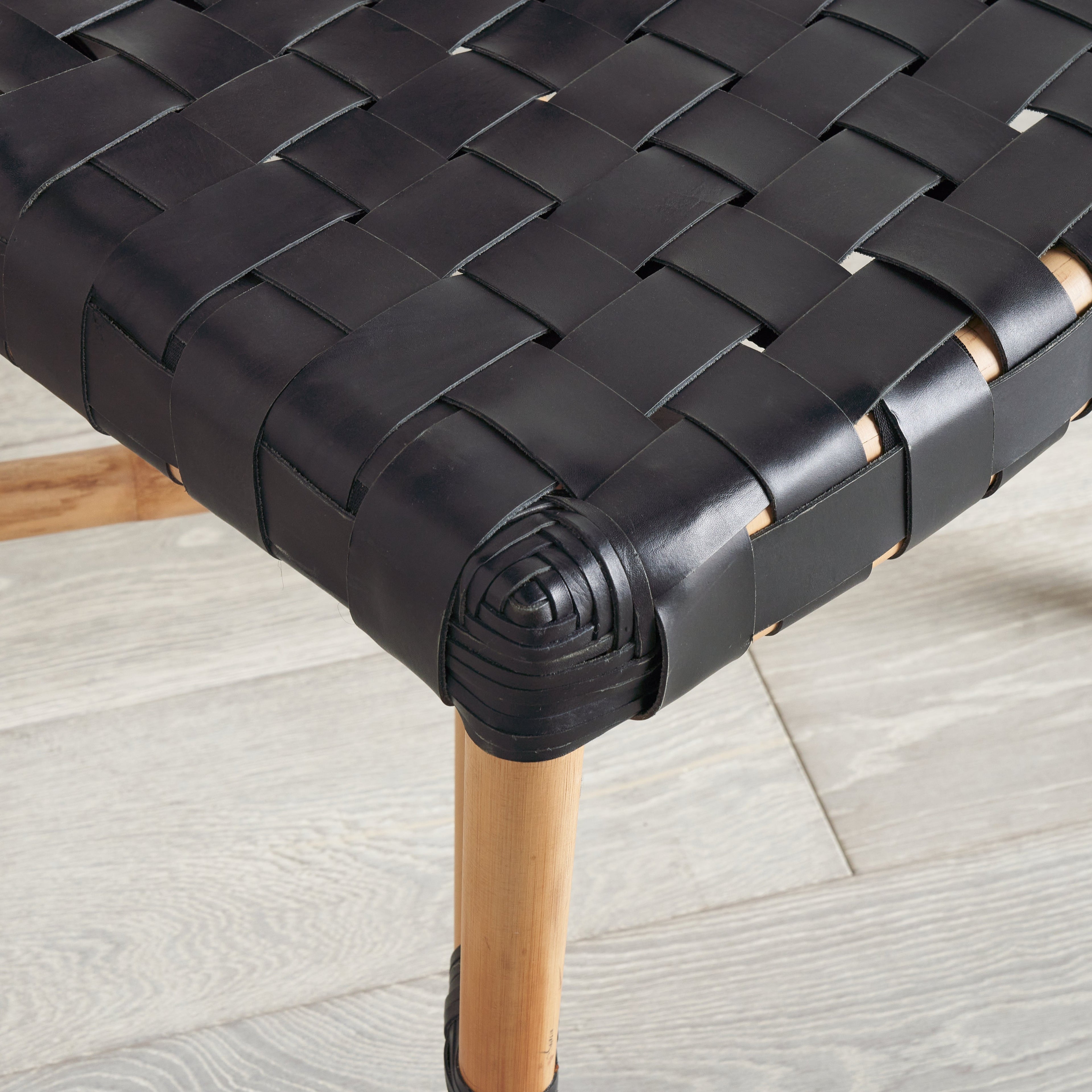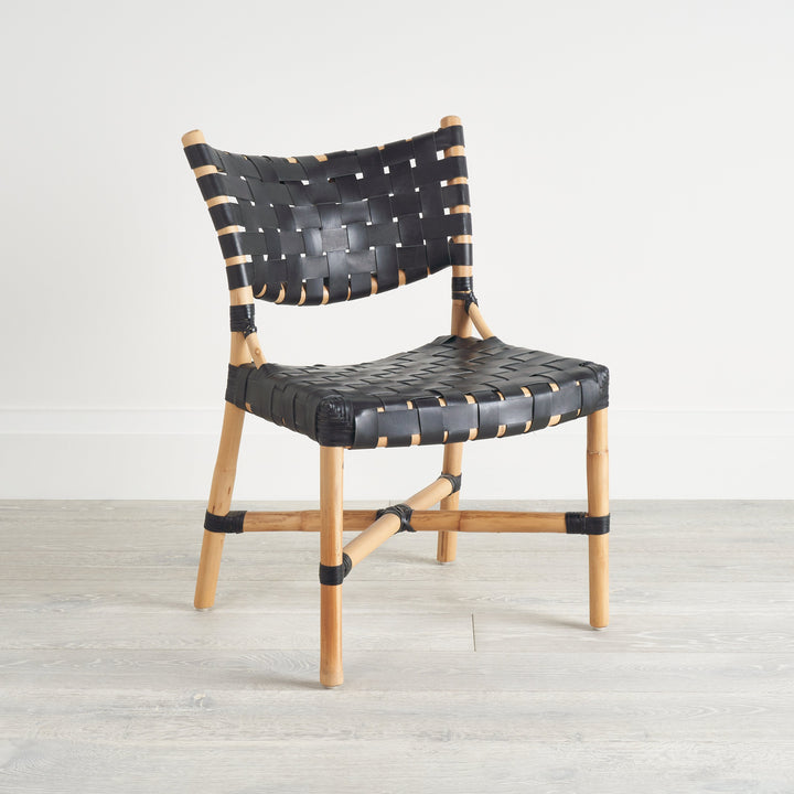 Crafted from black leather straps and natural rattan, the open weave of the Morris Side Chair contrasts against a curvilinear frame for a stunning dining chair. Leather and Rattan are natural materials. Differences in color and pattern should be expected and celebrated.