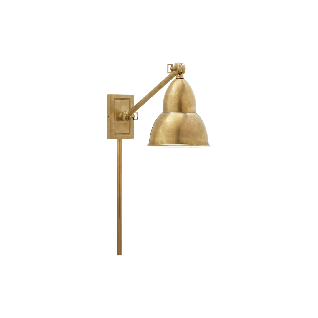 The French Library Plug-in Swing Arm Wall Sconce is a versatile industrial lighting option. With adjustable arms and a smooth shade, this hand-rubbed antique brass lamp allows you to direct light exactly where it is needed. It can be used as a hardwired fixture and features a matching cord cover.