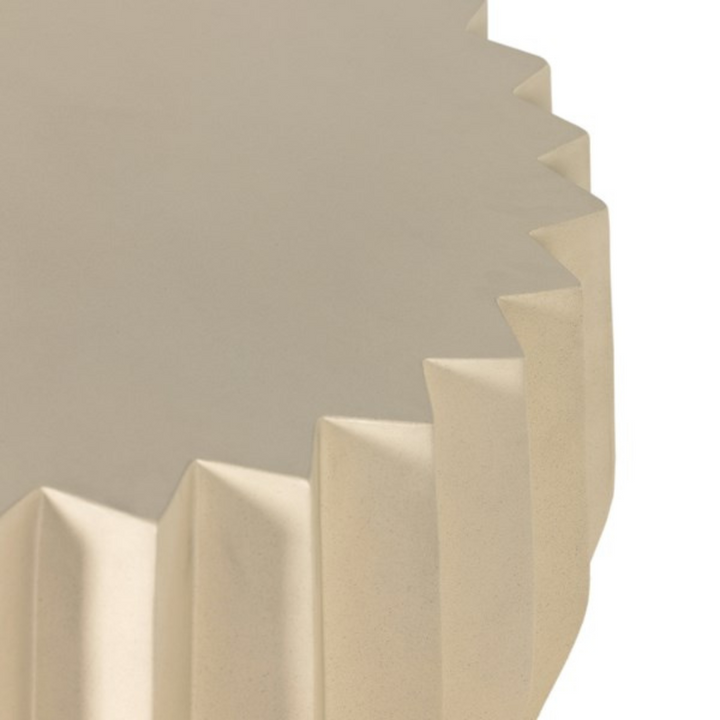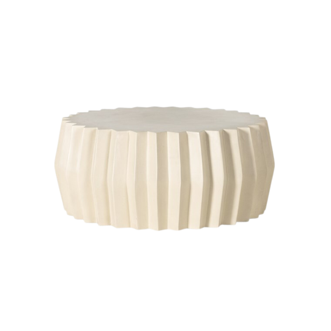 Sculptural modern, made for outdoors. Fluted edge detailing delivers intriguing depth to a solid concrete coffee table finished in a crisp white. Cover or store indoors during inclement weather and when not in use.