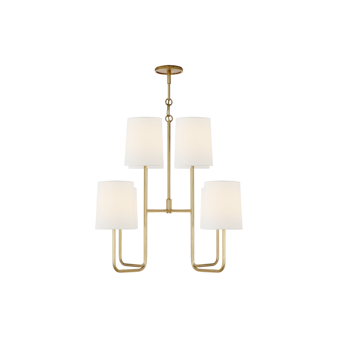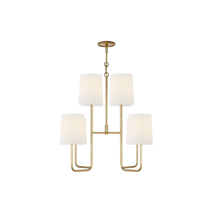 Illuminate your space with the Go Lightly Chandelier, crafted with a gilded finish and adorned with linen shades for a sophisticated touch. Achieve a warm and elegant ambiance with this stunning piece, perfect for any room in your home, including a master closet.