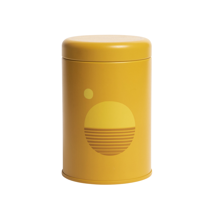 The unique design of the tin is inspired by the 70s, while the fragrance captures our favorite times of day in California. 5pm. Rustling grasses, baked earth, sun rays split between trees. Mellow, dry, tranquil. Notes of bergamot, hay, and golden poppy.
