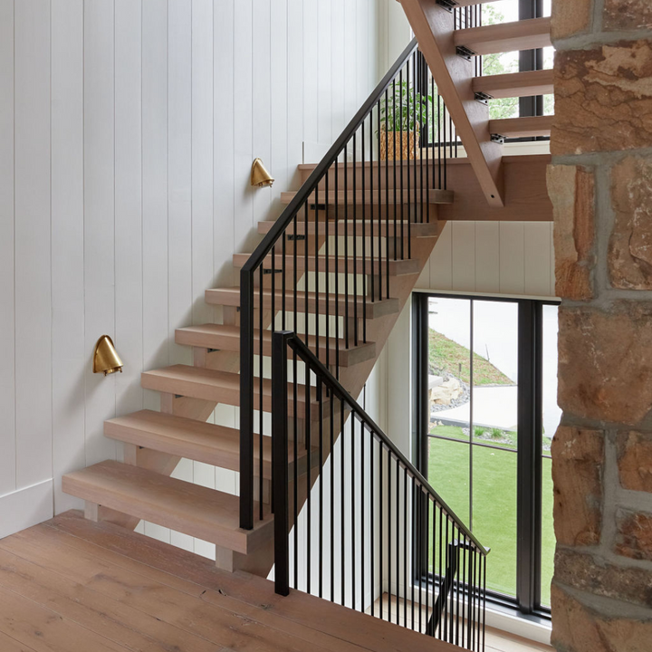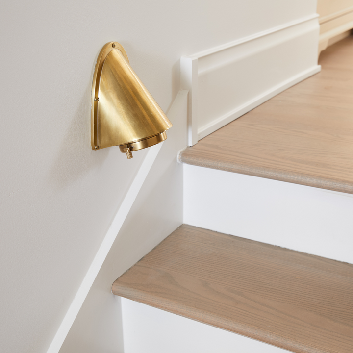 The Grant Small Sconce by Ralph Lauren features a sleek and industrial design, combining a domed shade with a prismatic glass lens. Available in natural brass, it adds a touch of luster to any space. Perfect for hallways and entryways.