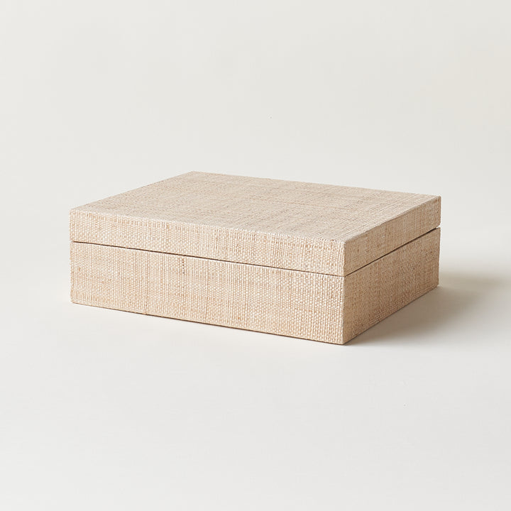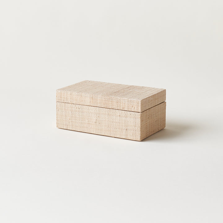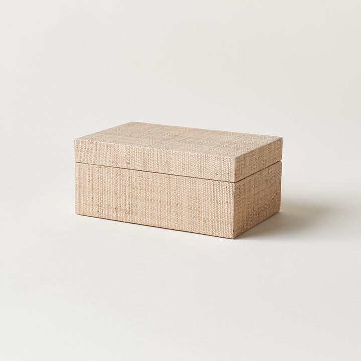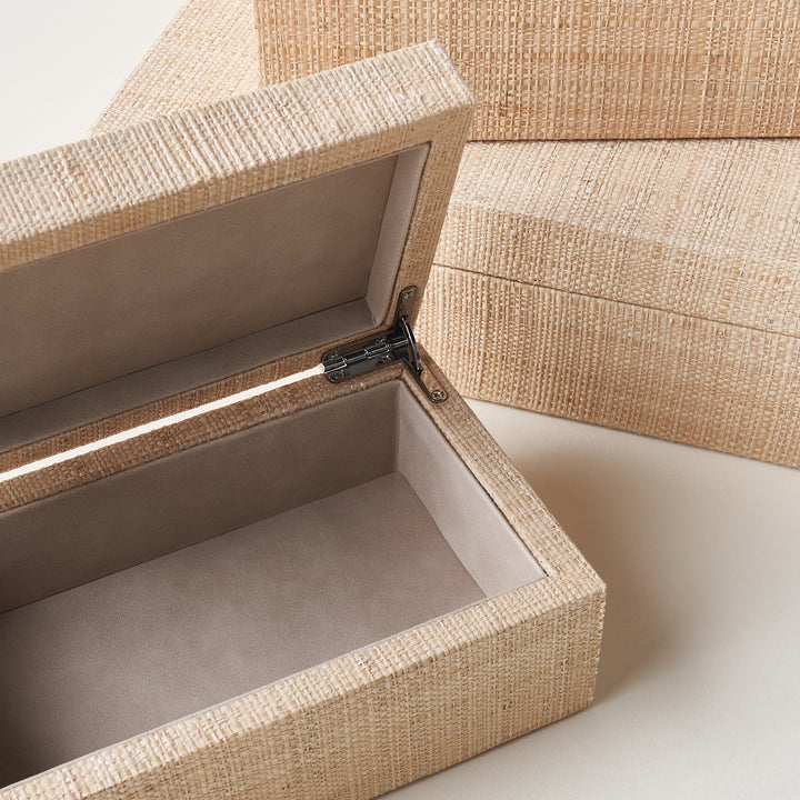 These beautiful Grasscloth Hinged Boxes are a stunning and stylish solution for organizing any space. The exterior is covered in a natural grasscloth, while the interior is lined with a soft light grey suede and finished with sturdy metal hinges. Available in three sizes, these boxes are perfect for storing jewelry, knick-knacks, and for styling shelves.