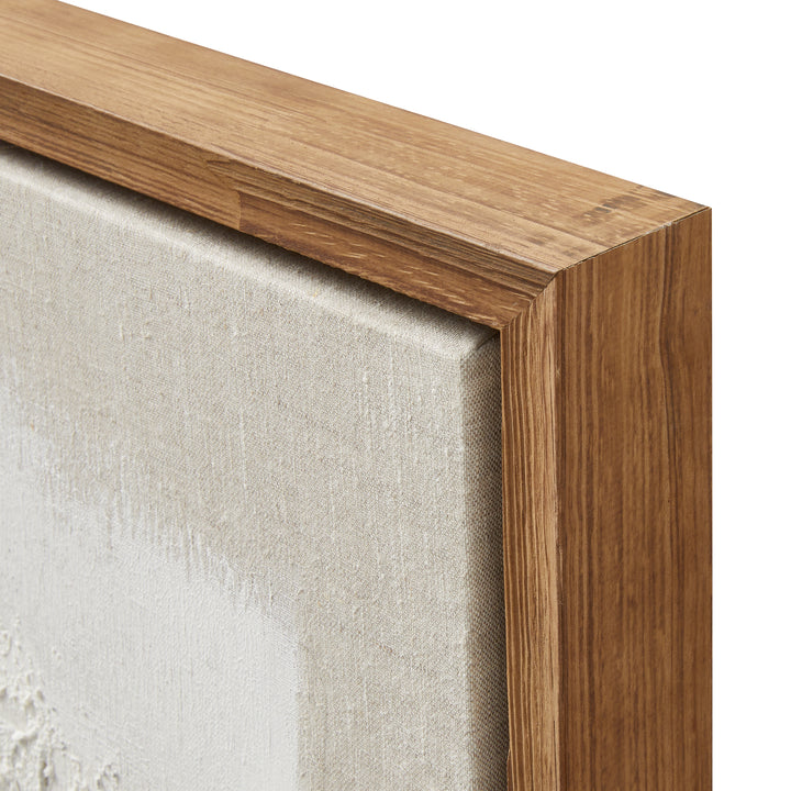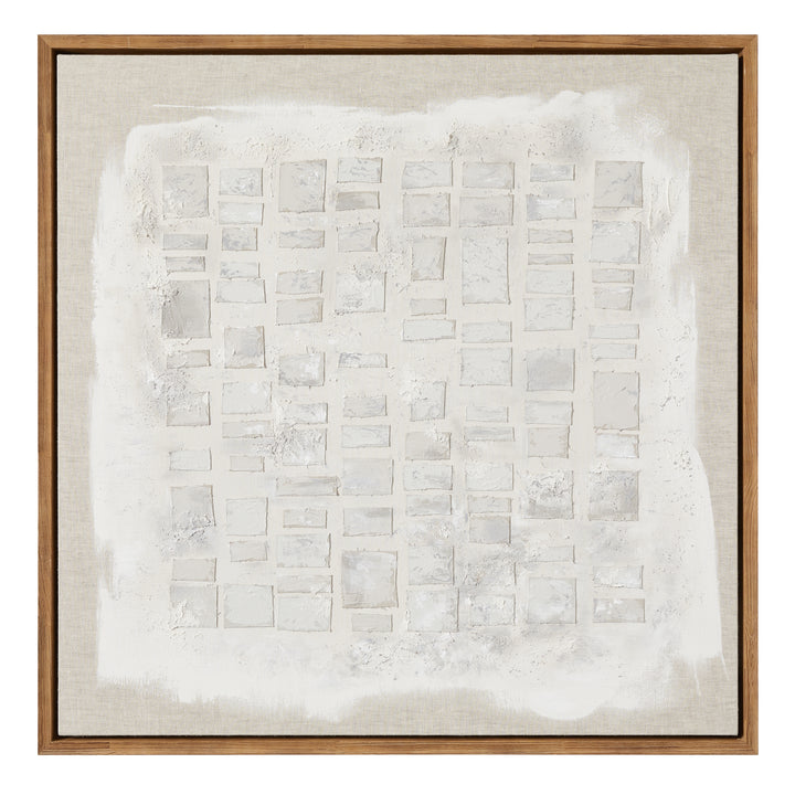 Gravel is a tactile marvel from the Kate Marker x Leftbank Art collection. It is a hand-painted creation on brown canvas that showcases exquisite embellished textures. The piece features a rhythmic interplay of organic, repeating geometric shapes in serene, neutral hues. It is set against a canvas backdrop and framed, combining rustic charm with modern artistry in a timeless manner.