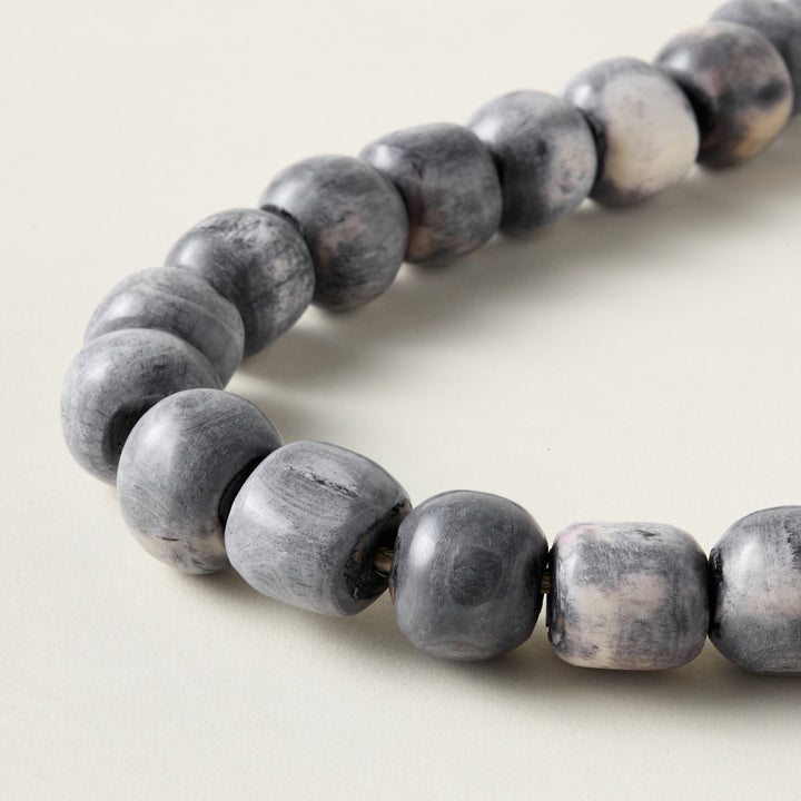 Admire this beautiful strand of bone beads from Kenya. East African bone beads are handcrafted by artisans using recycled cow bone. Each bead is individually carved and polished, and is truly one of a kind. Due to the handmade nature of these beads some beads may have a wood core that is more secure than others. Darkness of stripes may vary strand to strand from light to dark. Product varies as each strand is unique.