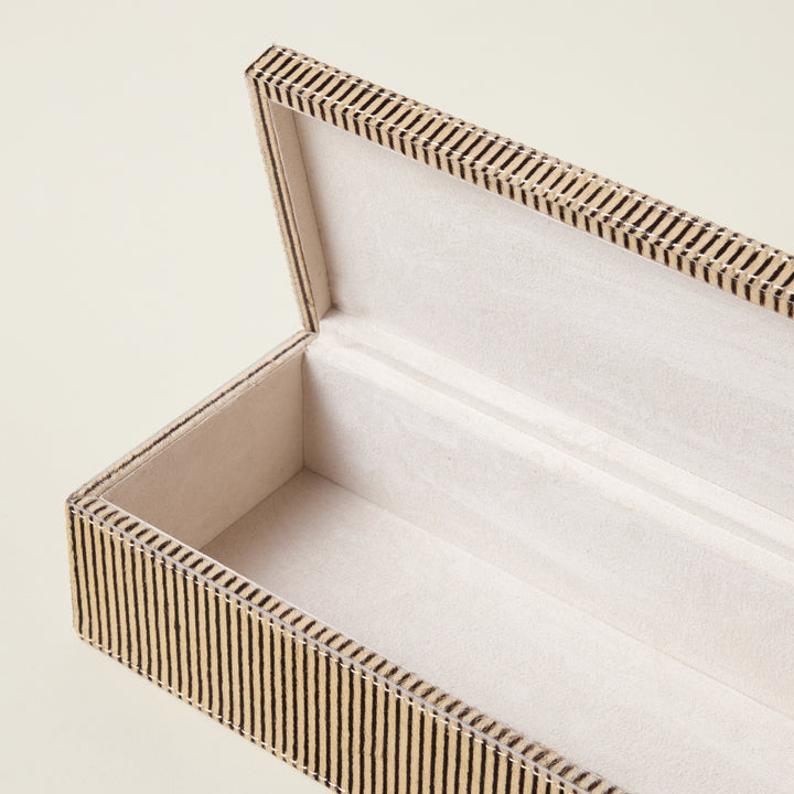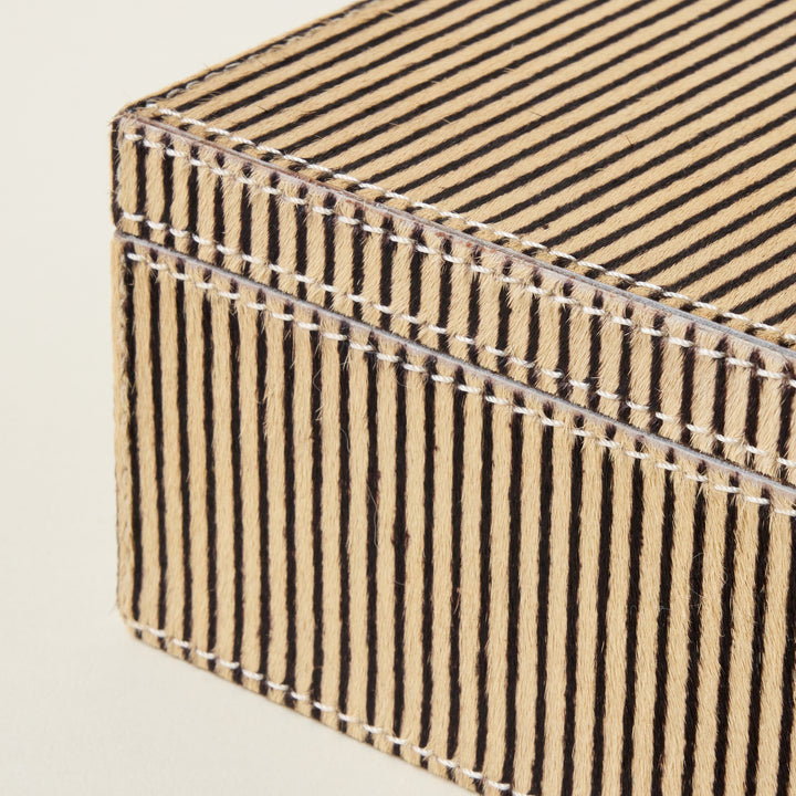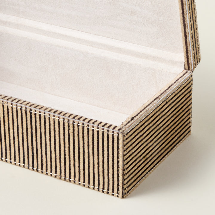 Elevate your storage with this handcrafted box, made from genuine hair-on-hide leather. Its natural, organic texture and sleek silhouette combine to create a sophisticated, tactile element that adds a refined touch to any room. This thoughtfully made piece is ideal for organizing your most precious valuables or for simply adding a layer of curated style to a tabletop, bookshelf, or dresser.