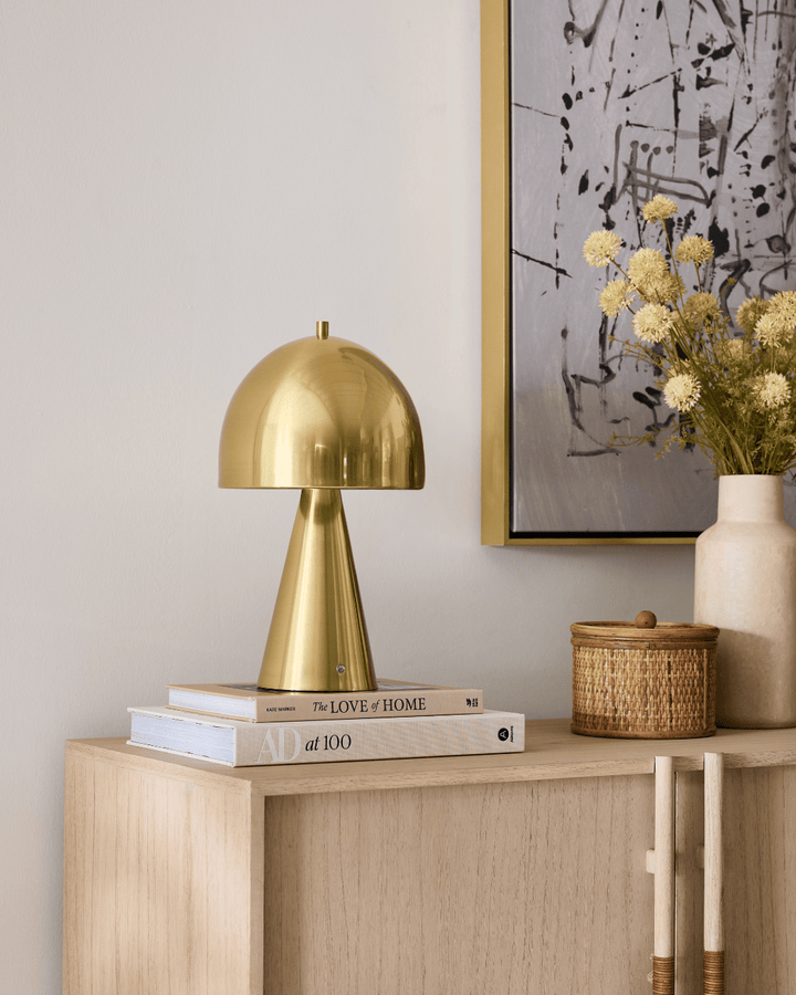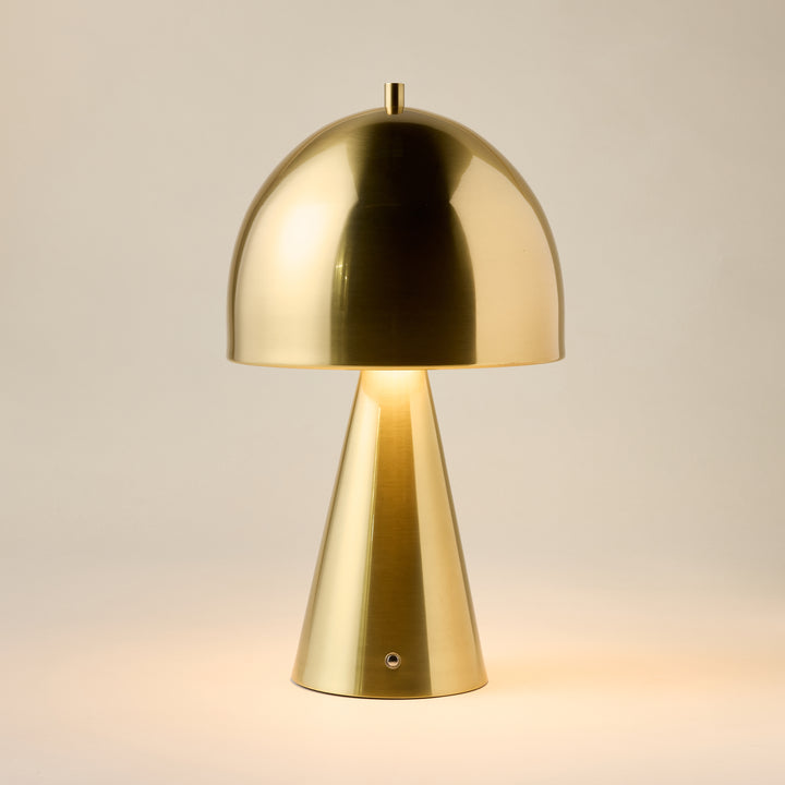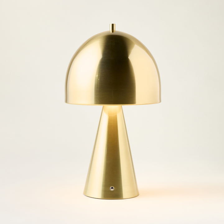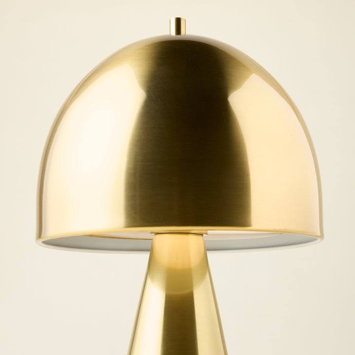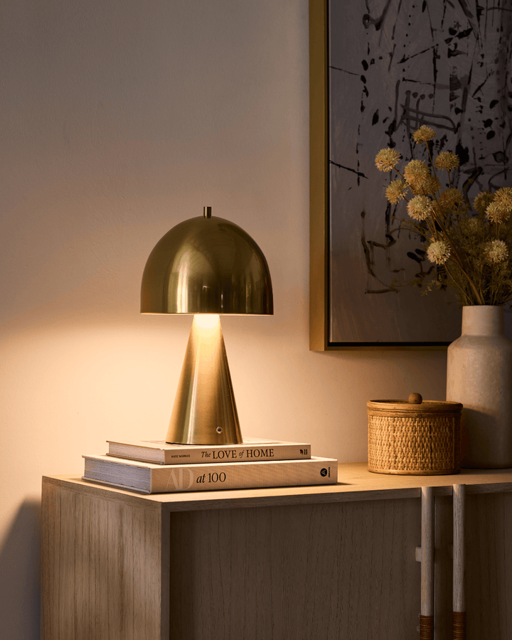 A perfect blend of unique design and modern technology. The Hopkinton Rechargeable Table Lamp features a distinctive geometric design with an oblong domed shade paired with a conical base. Its modern mushroom silhouette adds character to any space. Available in Aged Brass, this lamp is equipped with an integrated rechargeable LED, which is also dimmable and can be used while charging. With a recharge time of 3.5 hours, this lamp offers reliable, long-lasting illumination tailored to your needs.