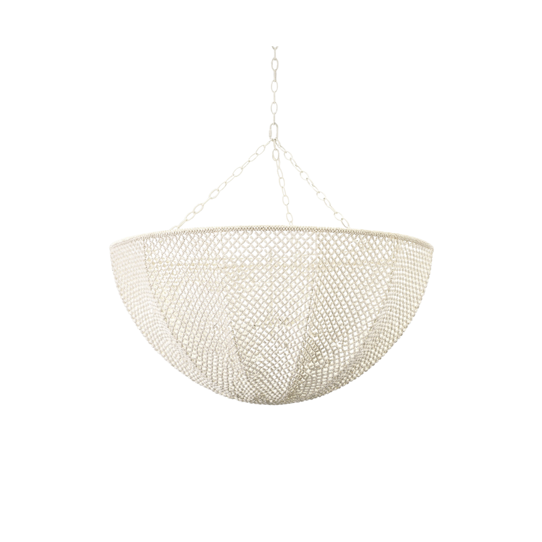 The Isla Chandelier combines hand-sewn wood and coco beads with a powder coated metal frame, creating a unique and elegant pendant. The pendant comes with an off-white finished chain and canopy hanging kit for installation. Elevate your space with this stunning, artisanal piece.