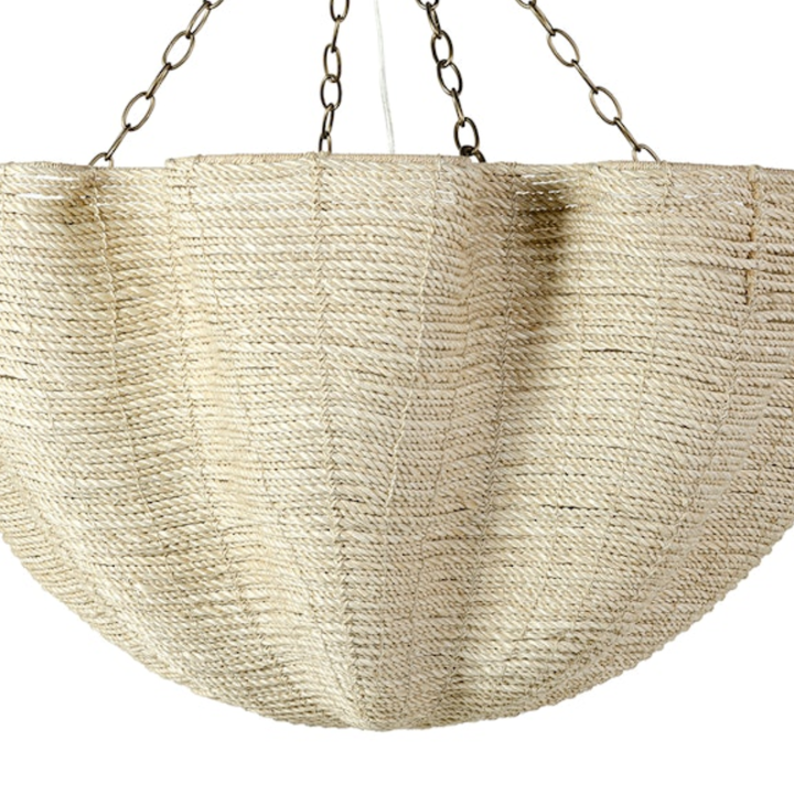 Natural abaca rope hand-twisted and woven over a powder coated metal frame creates an elegant, textured look for any space. The Isla Chandelier features an antique gold finished metal chain and complete hanging kit for seamless installation. The durable abaca weave paired with the sturdy metal base ensures lasting beauty.