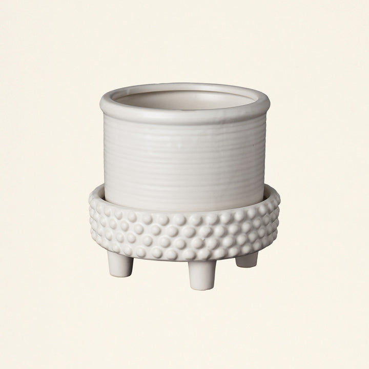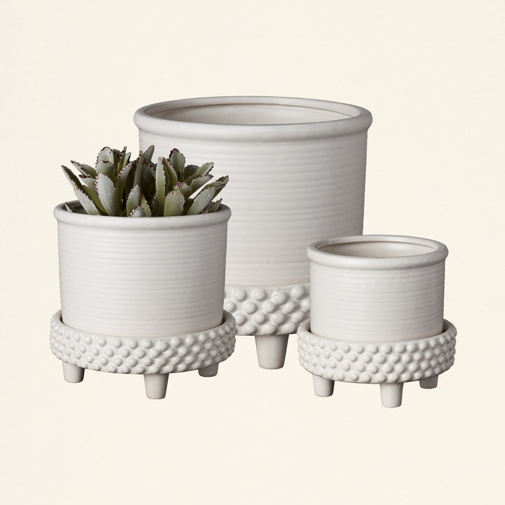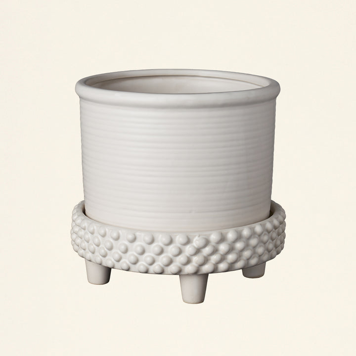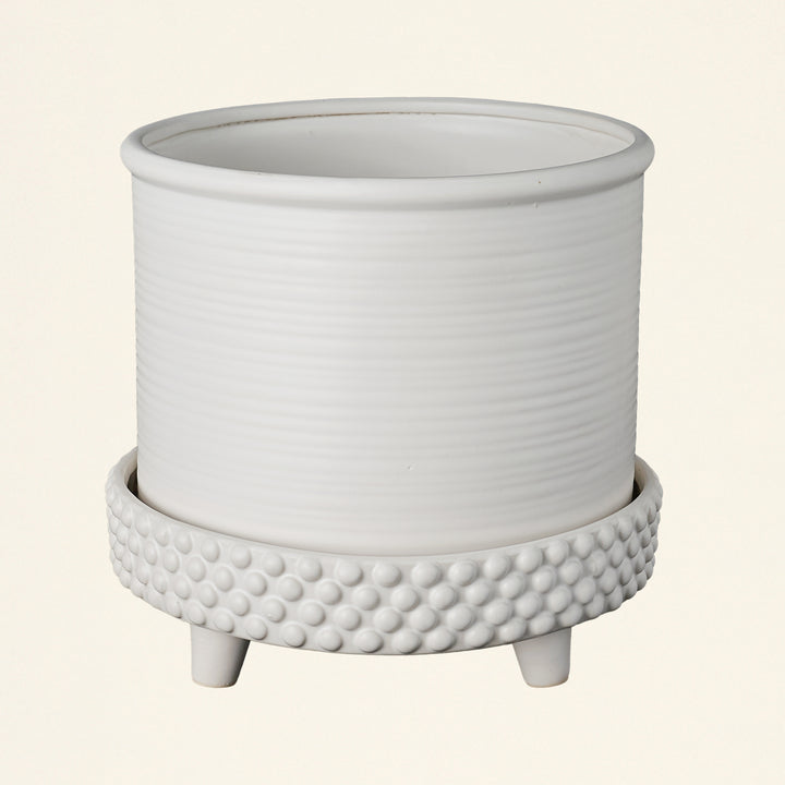 The terracotta finished in matte white of the Jasmine Footed Pot features embossed dots and stripes, elevating your favorite plants beyond ordinary. Suitable for outdoor or indoor use, it features a drainage hole and footed saucer. Comes in three different sizes.