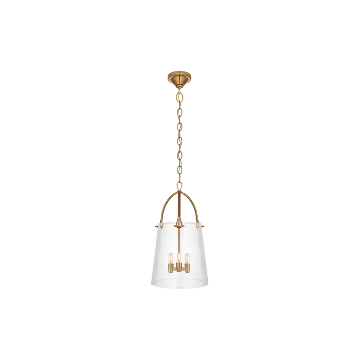 The Julian Lantern combines fashion and function in one elegant design. Inspired by Ralph Lauren's signature style, it features braided leather and brass accents, paired with a hand-blown clear glass shade. The interior metalwork is reminiscent of a raincoat's toggle clasp. Illuminate your entryway or kitchen with this stunning piece.