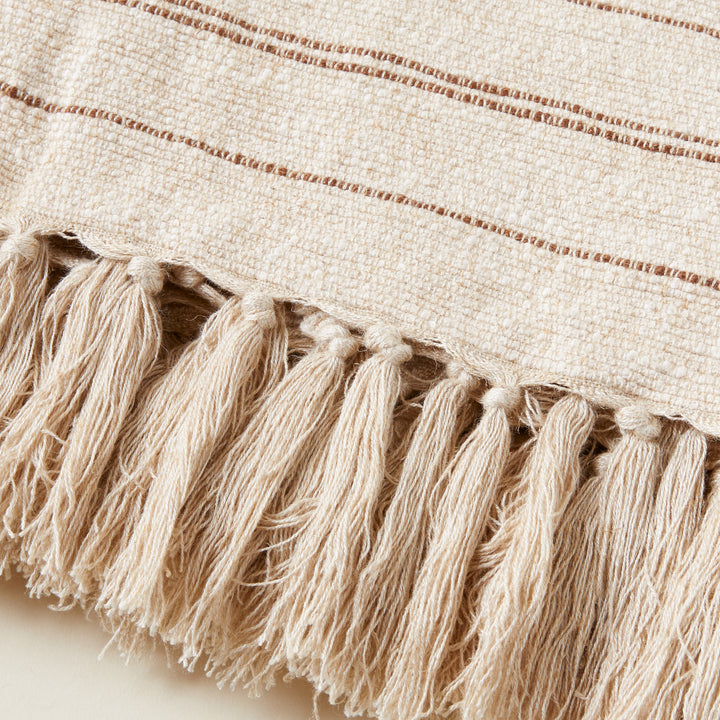 Introduce the luxurious Kenna Blanket, a thoughtfully made essential that brings comfort and artisanal style to your living space. Ethically produced and hand-woven in India, each blanket is crafted from a soft cotton, rayon, and linen blend. The rich ribbed texture and warm chestnut stripes on a neutral background create a beautiful, layered look that feels both timeless and curated.