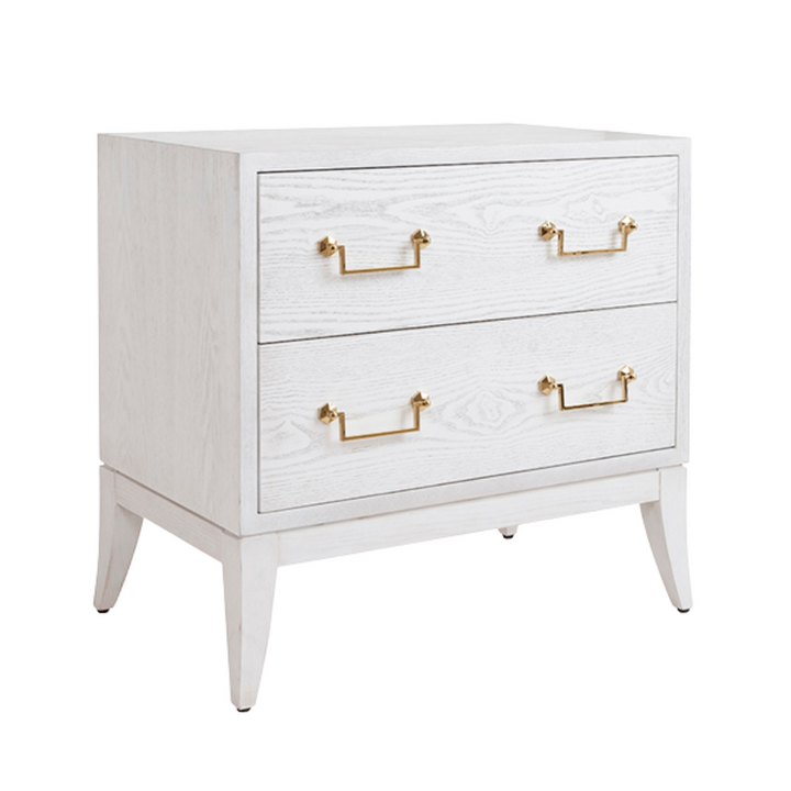 A beautiful way to elevate your living space, the Sabre Leg 2-drawer Side Table is a perfect blend of style and function. This versatile piece features a sleek white-washed oak finish and a stylish brass swing handle, adding a touch of glamour. The two drawers provide ample storage for your essentials, while the open design adds a sense of airiness.