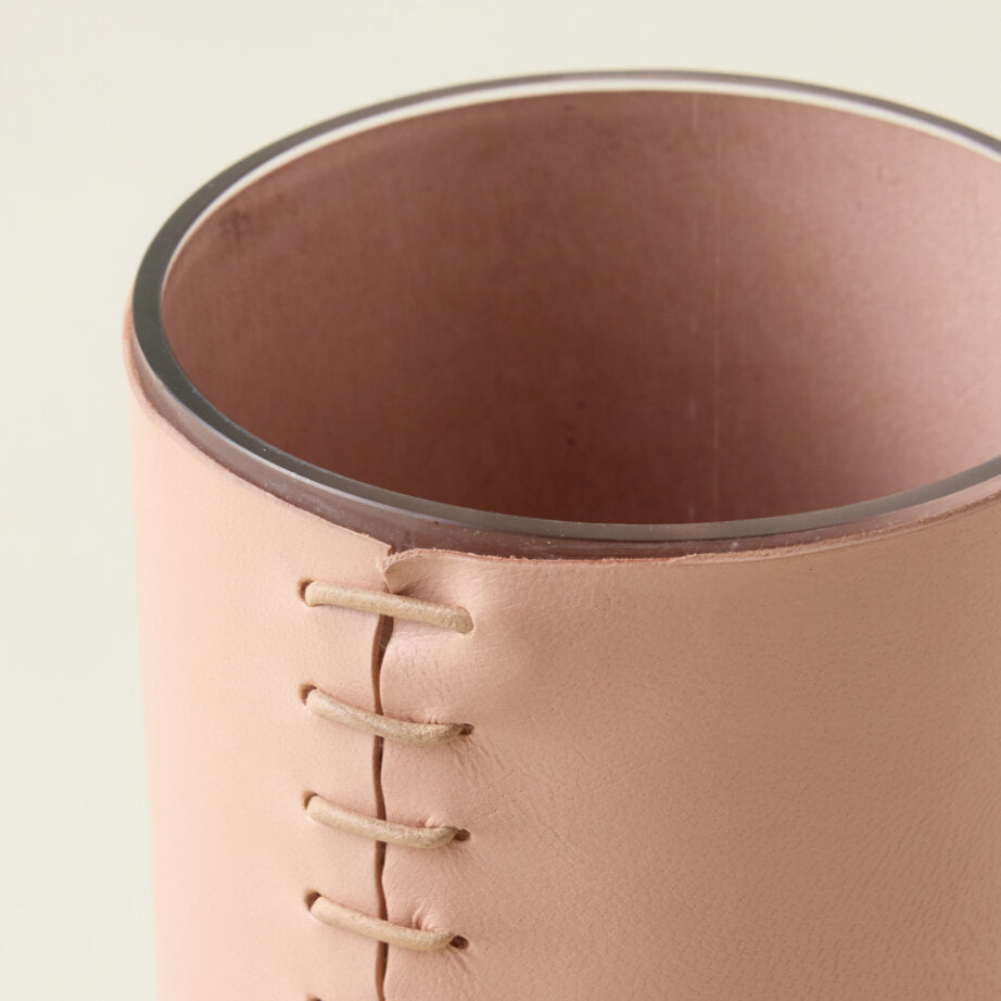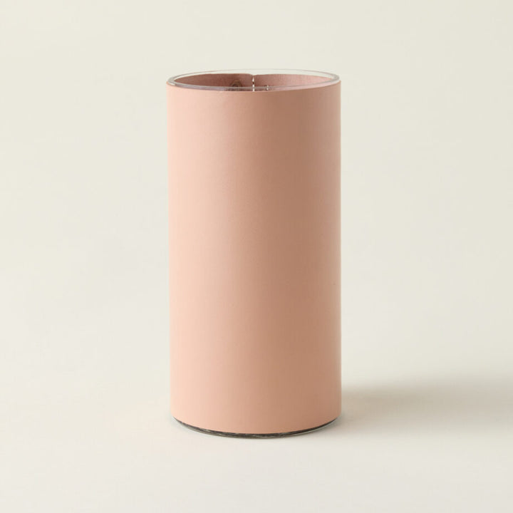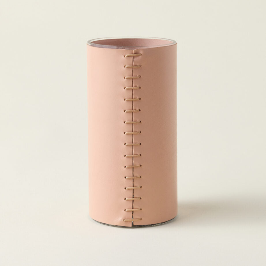 Expertly handcrafted, this Leather Wrapped Vase boasts a peachy tan leather wrap that elevates any floral arrangements. The soft leather showcases a natural grain, making each vase unique, while the decorative stitch detail adds visual interest.