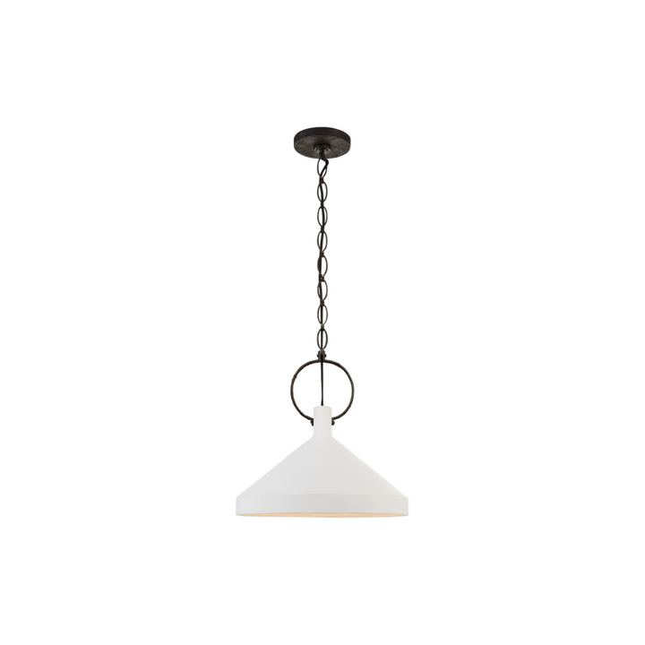 The Limoges Pendant by Suzanne Kasler blends industrial design with refined elegance. Featuring a natural rust-finish conical shade in plaster white, it evokes a warm, old-world ambiance reminiscent of Parisian nights. This versatile pendant adds character and sophisticated lighting to any room.