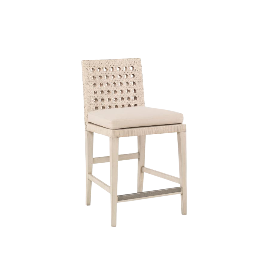 The Lindsey Counter Stool is a timeless piece crafted from mahogany solids and features an intricately-woven, open-peel cane back for a stunning visual. The square back and arms are flawlessly complemented by tapered legs, while an upholstered linen-like flax colored fabric seat adds comfort and a touch of elegance. Also available as dining arm and side chairs.