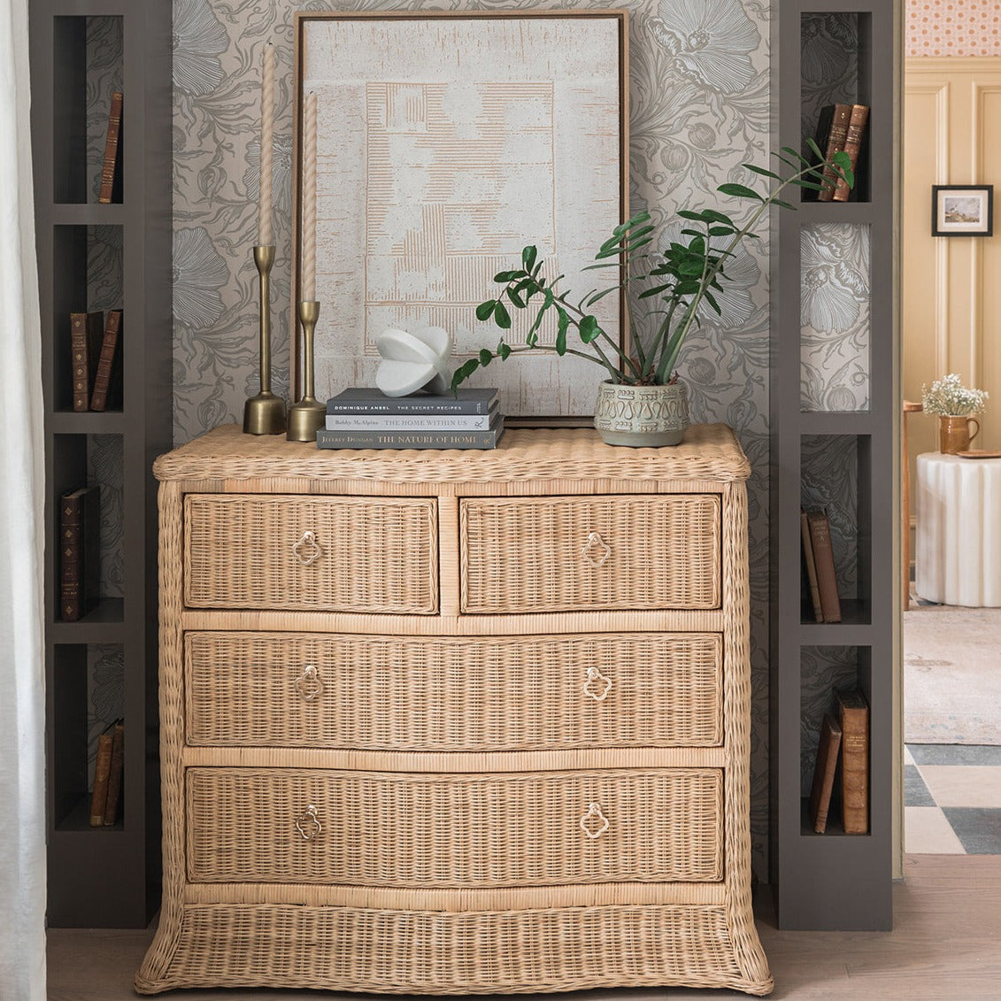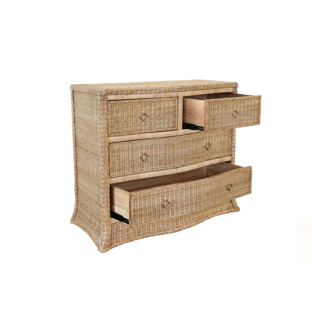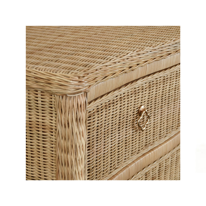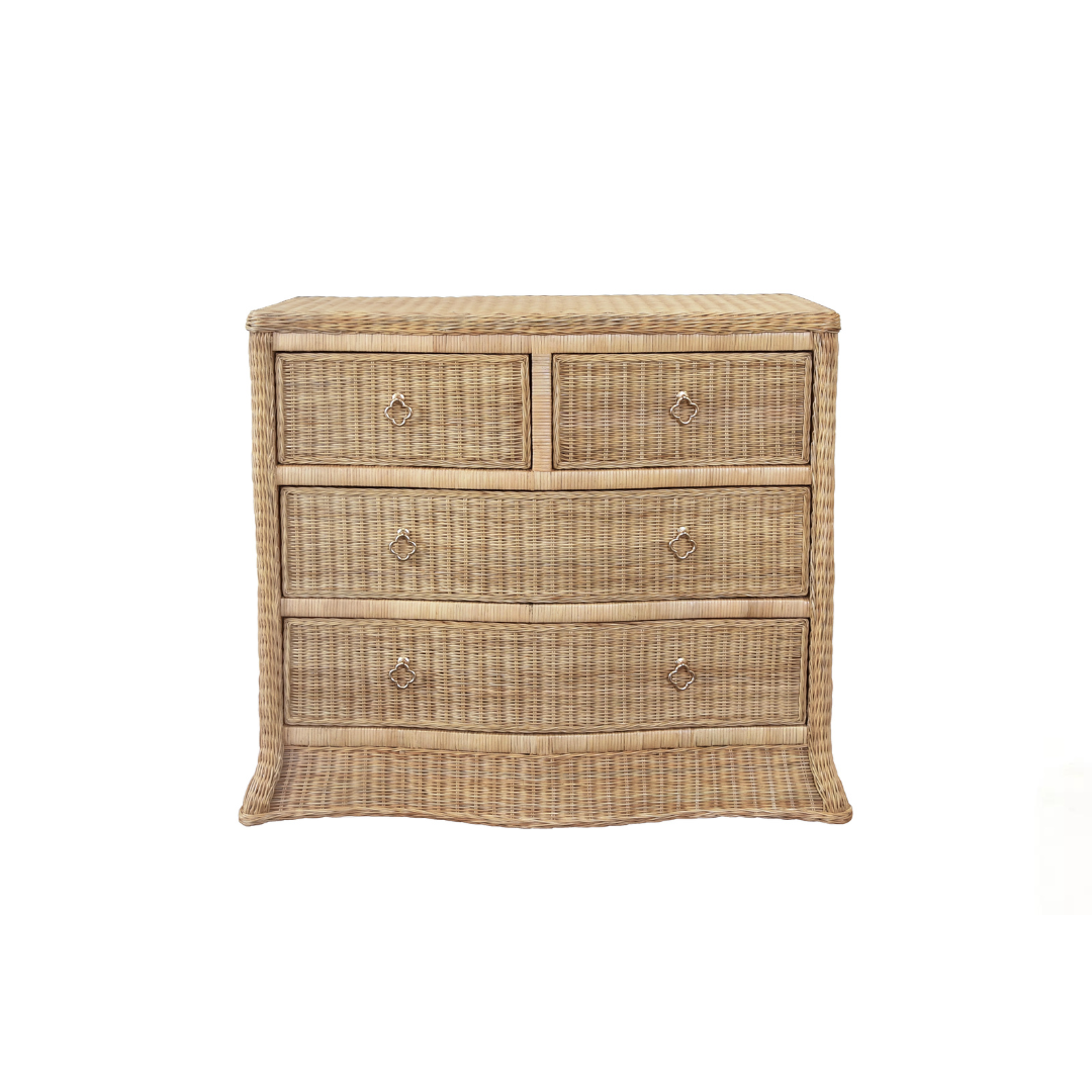 A perfect blend of effortless style and functionality. The Lula Chest offers ample storage with four soft-close drawers while bringing beautiful visual interest to any space. Crafted with elegant woven rattan panels and satin brass pulls, each piece is unique with natural variations in the rattan. It is a stylish and versatile piece for any bedroom or living space.