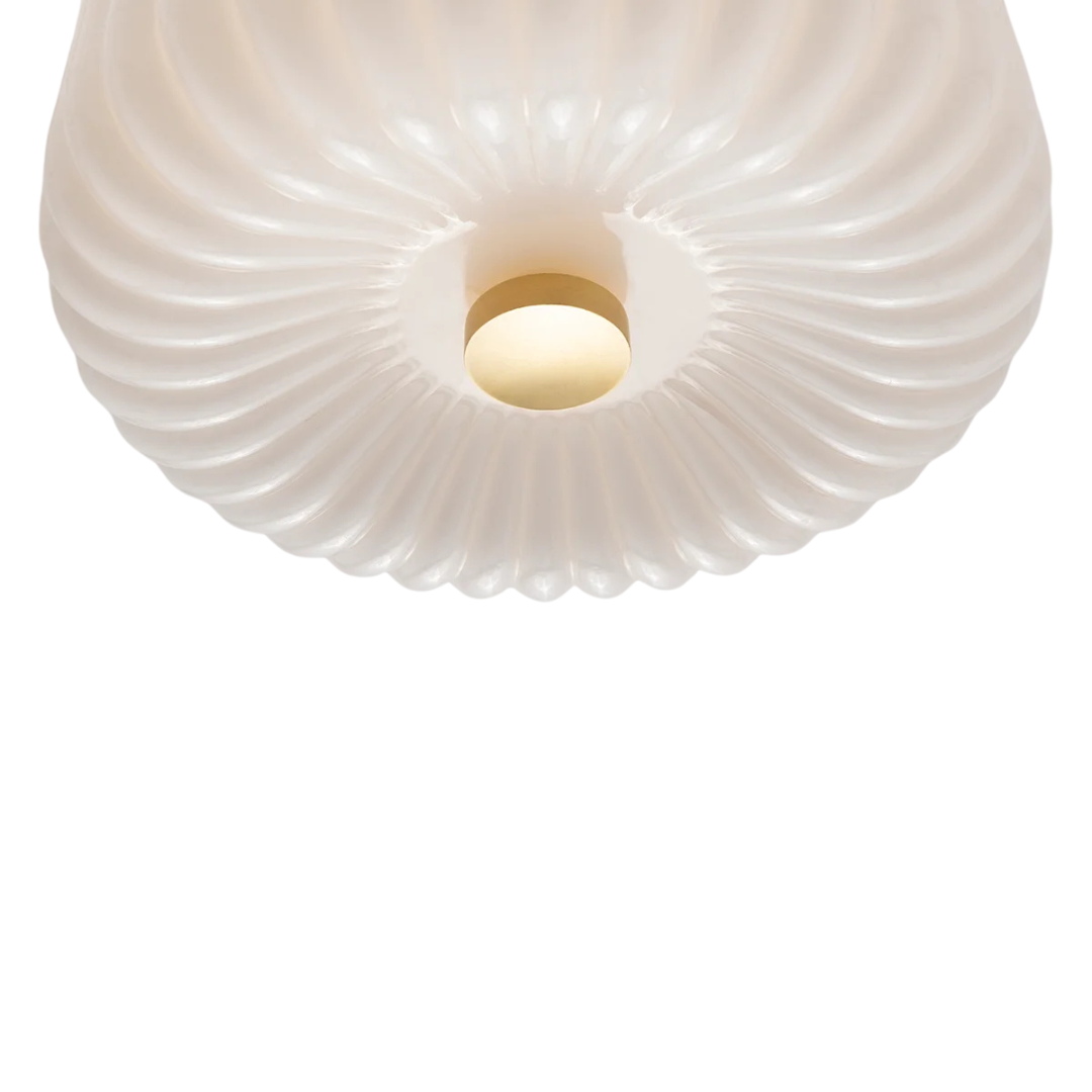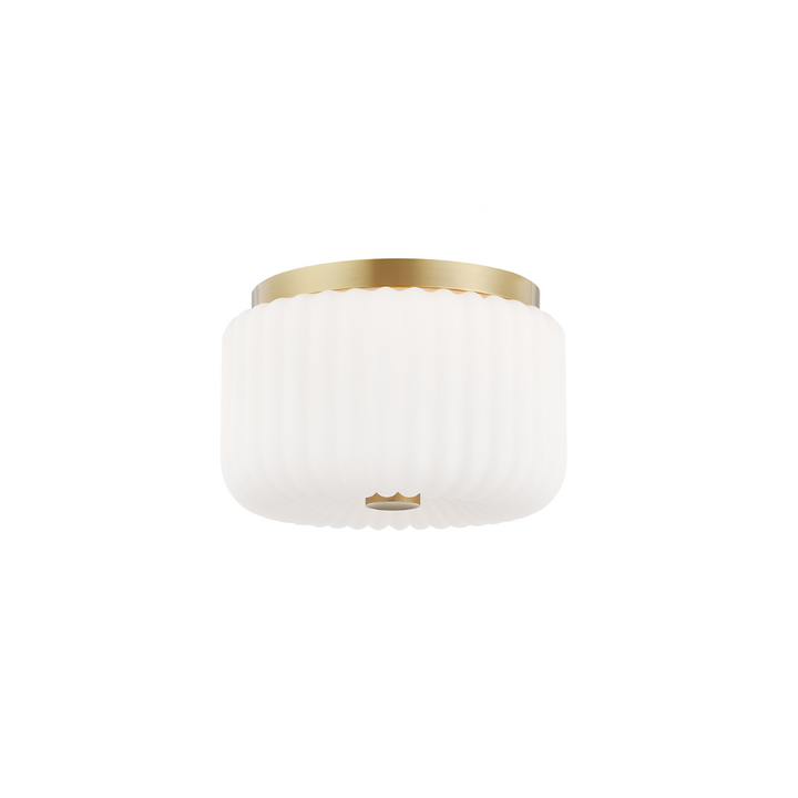 The Lydia Flush Mount blends vintage style with modern functionality. The ribbed Opal glass shade adds a touch of elegance to any space. Complete with Aged Brass accents, this flush mount is UL and cUL listed for damp locations, making it a versatile and practical addition to any room.