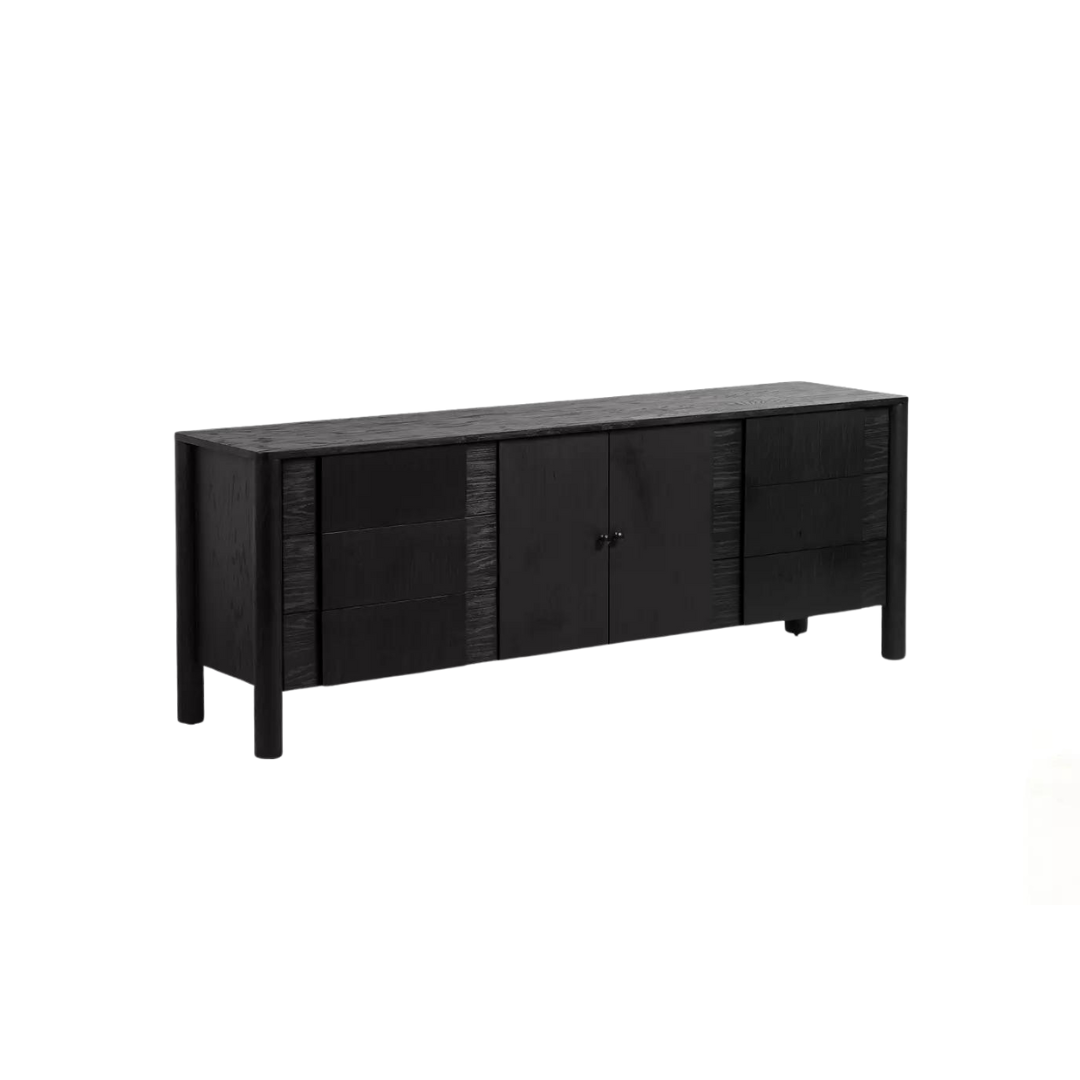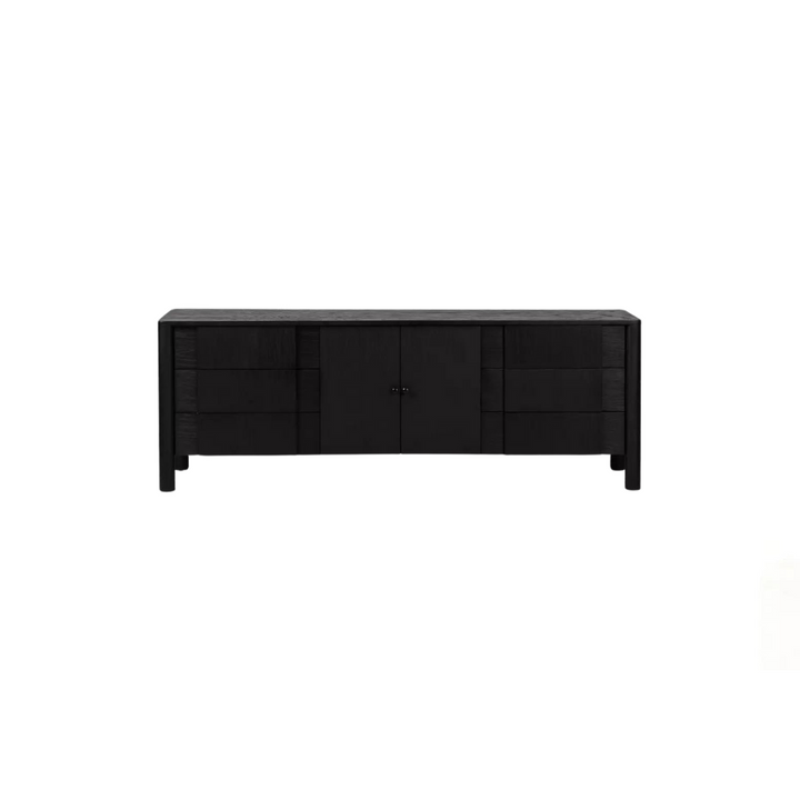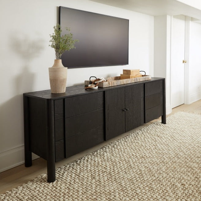 The Lydia Media Console features an elegant ebony finish, showcasing the natural graining of its oak veneer. Enjoy ample storage space with six drawers and center shelving for your media or living room. Convenient cord management is simple with rear cutouts.