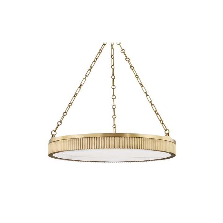 The Lynden Chandelier brings together sophisticated design with versatile elegance. Featuring a cream alabaster flat glass shade paired with a distinctive brass frame, this fixture seamlessly blends varying hues of marbled and metallic finishes. The combination of solid brass construction and alabaster creates a refined aesthetic that works beautifully in entryways, dining rooms, or living spaces.