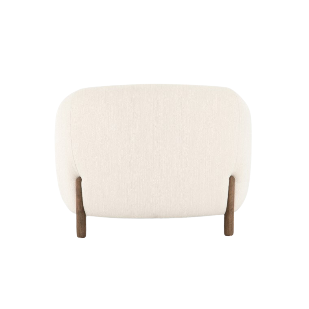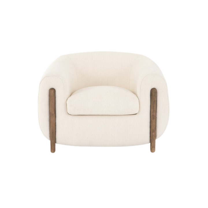 A fresh take on the traditional tub chair, with exaggerated depth for drama and comfort. Solid rubberwood legs intersect ivory upholstery for a clean contrast of color and scale. Performance fabrics are specially created to withstand spills, stains, high traffic and wear, ensuring long-term comfort and unmatched durability.