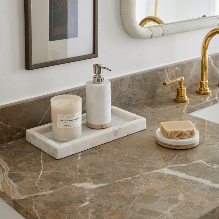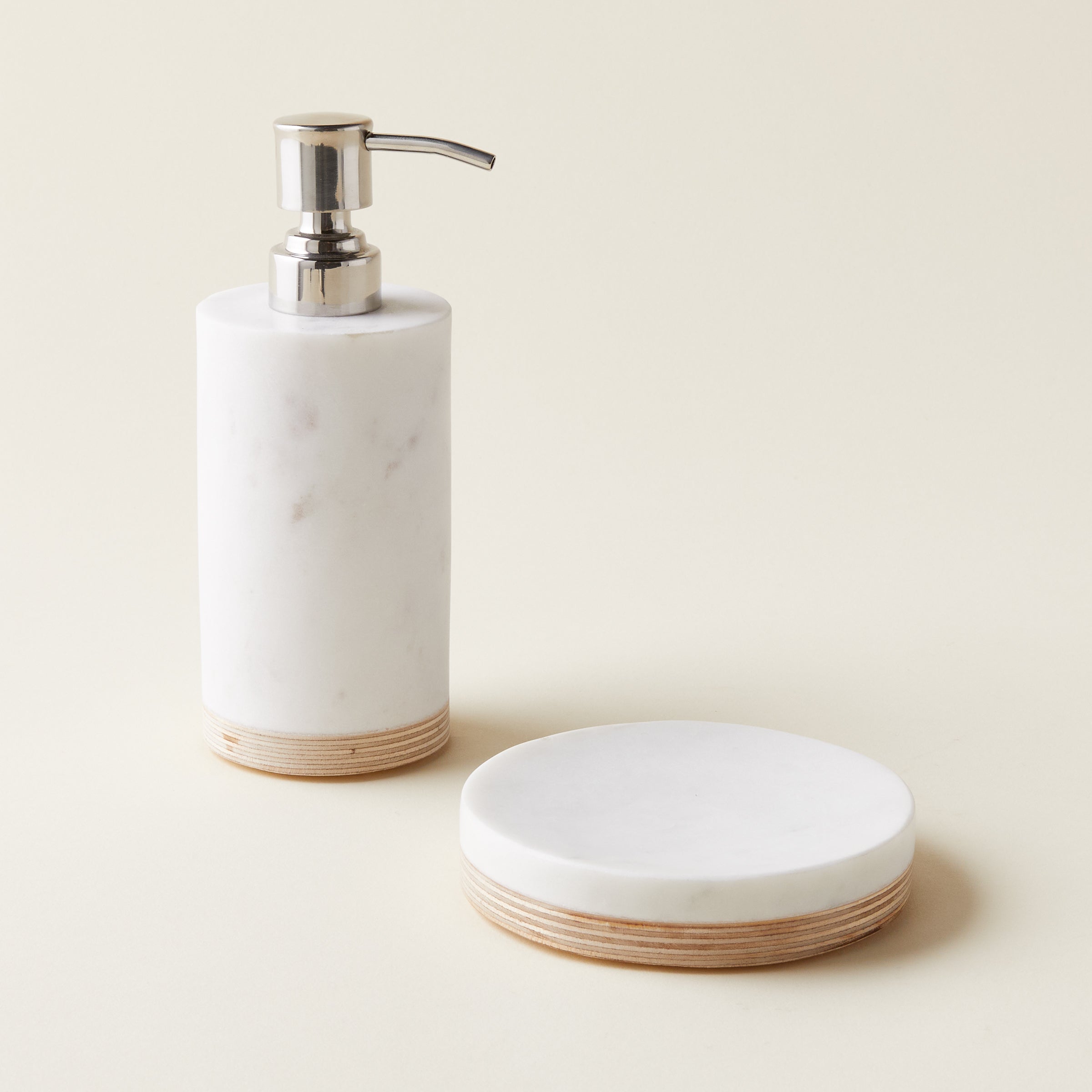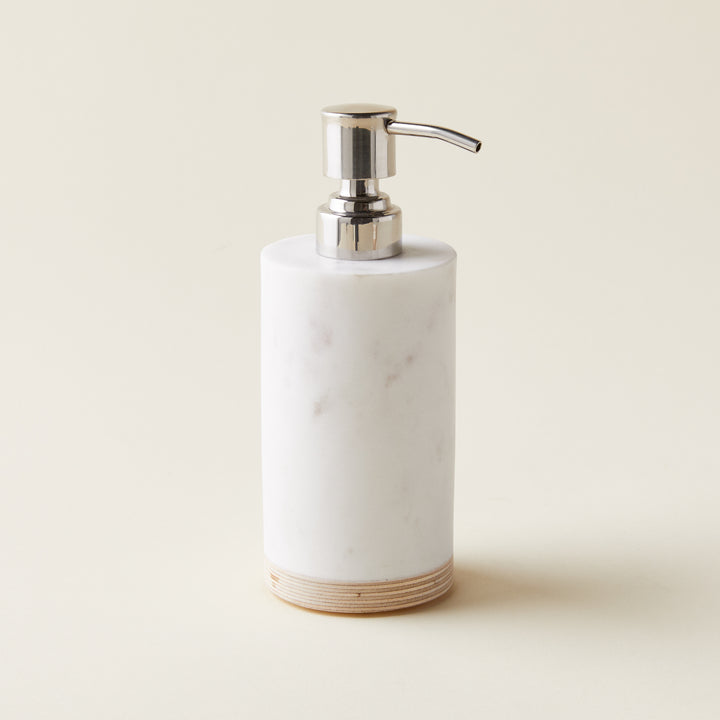 Elevate your countertop decor with this Marble and Wood Soap Dispenser. Crafted from balsa wood and durable marble, this dispenser provides a stylish and functional accessory for any bathroom or kitchen.