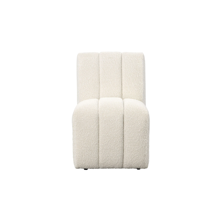 The Martha Dining Chair features durable boucle performance fabric paired with solid pine wood construction, finished in a soft cream tone. This versatile piece combines contemporary style with practical durability, making it ideal for dining rooms, kitchens, or casual seating areas. The performance fabric resists wear and staining, while the sturdy pine frame ensures lasting stability.Β