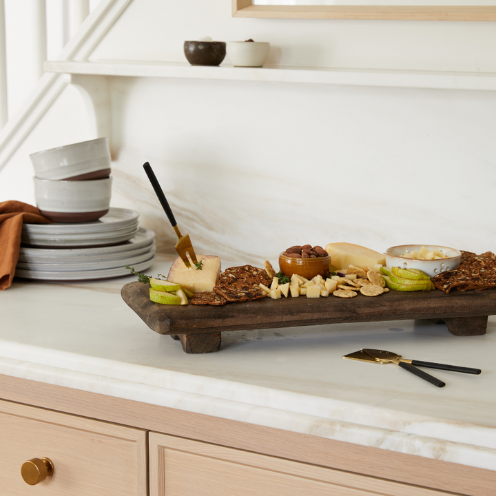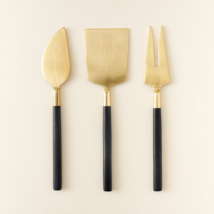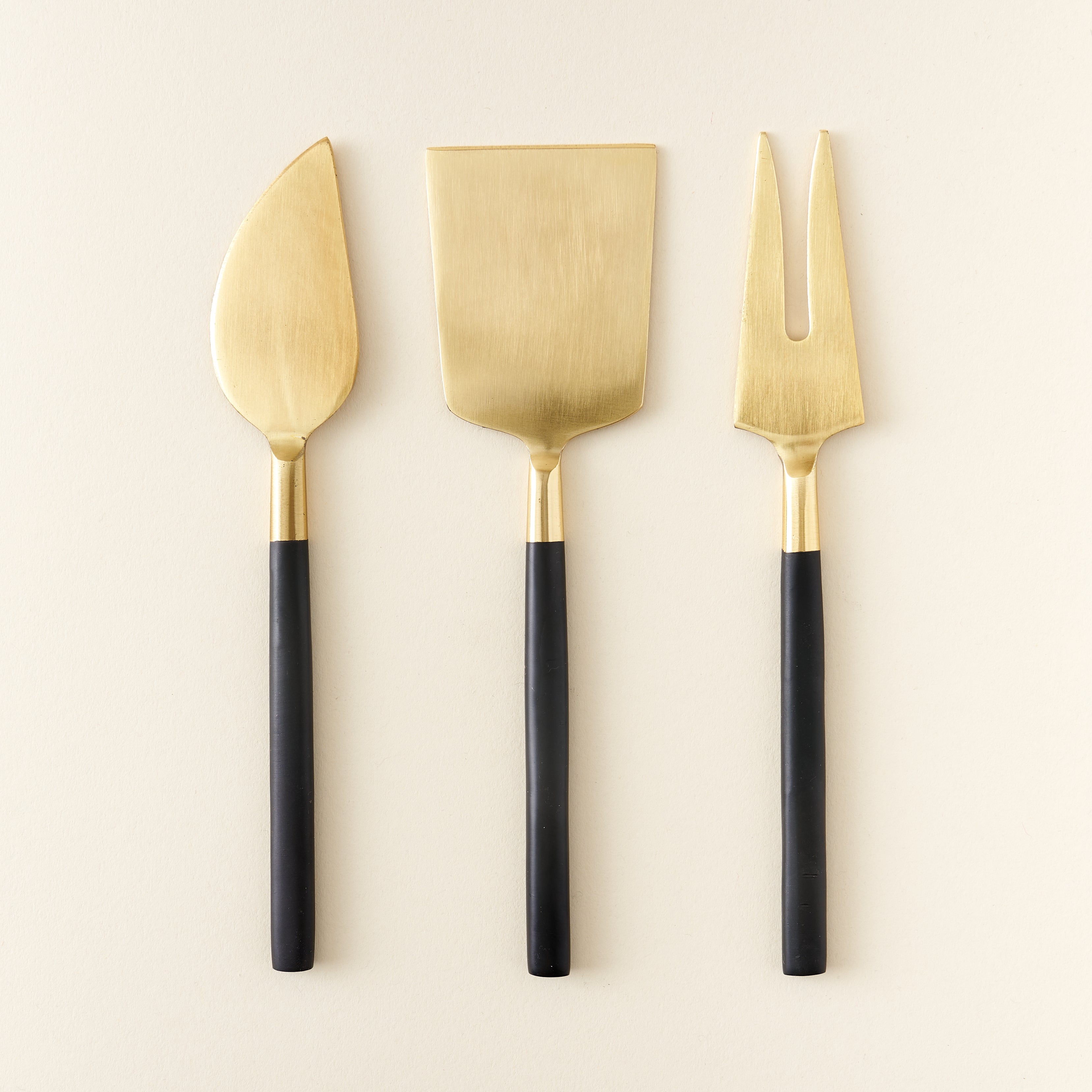 Set of three cheese tools with black handles and a matte brass finish. Includes a pronged server, spreader, and wedge knife.