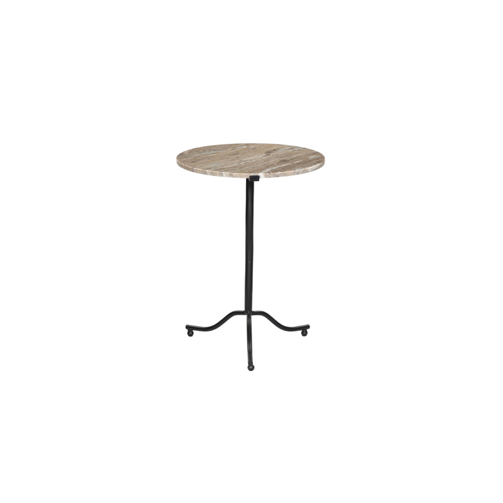 The Meribel End Table features a striking dark brass base that provides a bold contrast to its smooth taupe marble top. The marble’s heavy veining adds dynamic movement and visual interest, making this piece both functional and a sophisticated accent for any living space. Its expert craftsmanship ensures durability and timeless style.