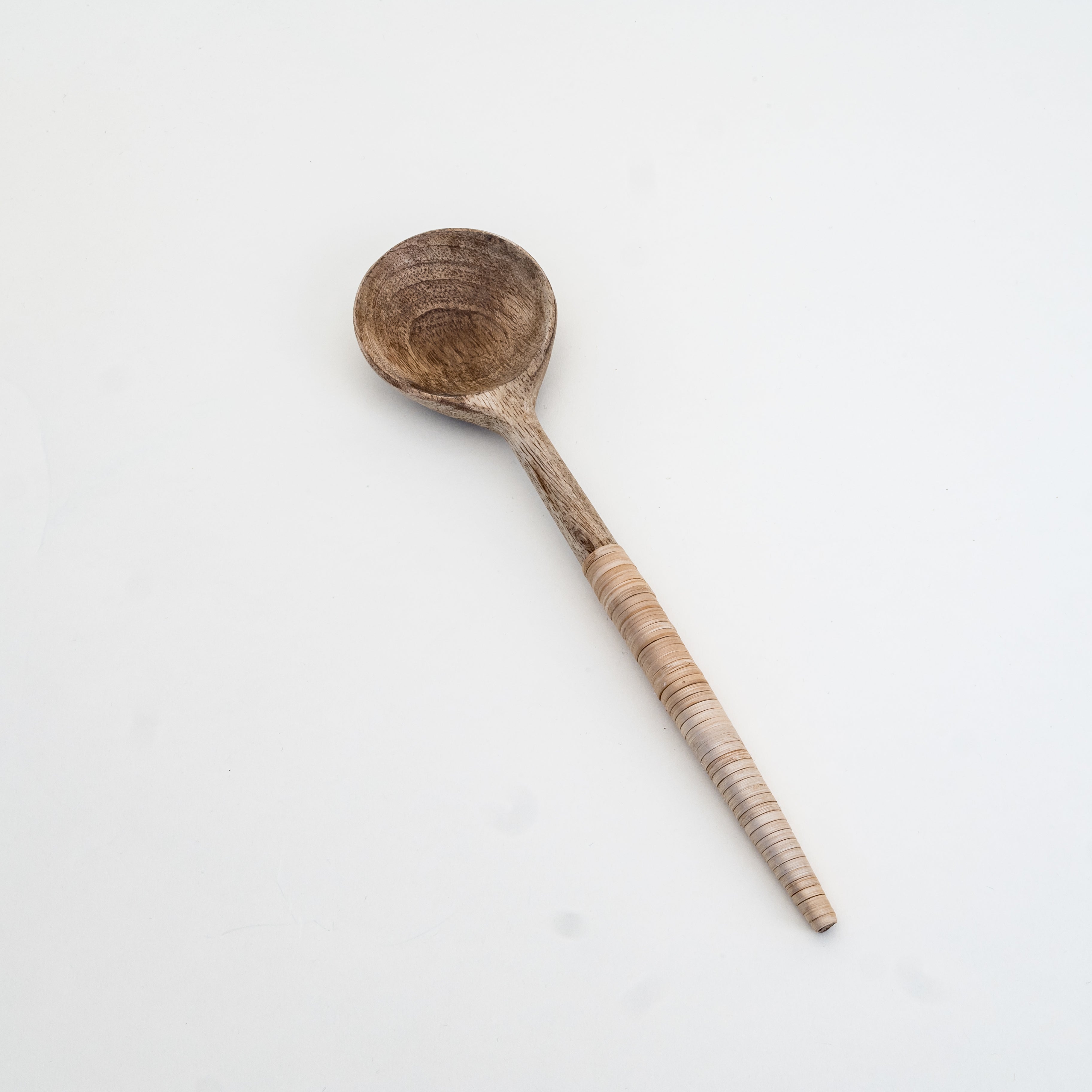 Richly grained mango wood is hand-carved into minimal yet functional spoons with rattan-wrapped handles. Hand wash is recommended. Choice of size, sold individually.