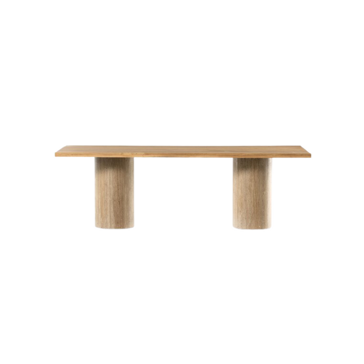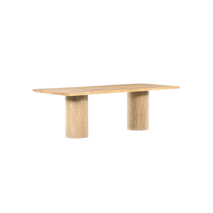Make a mixed material statement. Cylindrical legs of solid travertine provide a dramatically scaled base for a rectangular tabletop of solid natural oak, for a fresh twist on organic Seventies styling. Seats six comfortably.