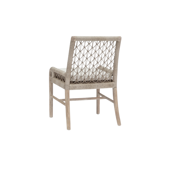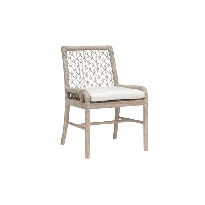 Crafted with a teak wood frame and legs, the Montecito Outdoor Side Chair features a hand-tooled cerused off-white polyurethane finish that enhances durability and style. Its hand-twisted all-weather synthetic abaca weave in a sand finish is expertly woven on the back and sides, offering resistance to cracking, peeling, fading, breaking, and stretching. Designed for comfort and longevity, this chair includes a loose seat cushion, making it an ideal choice for sophisticated outdoor living spaces.