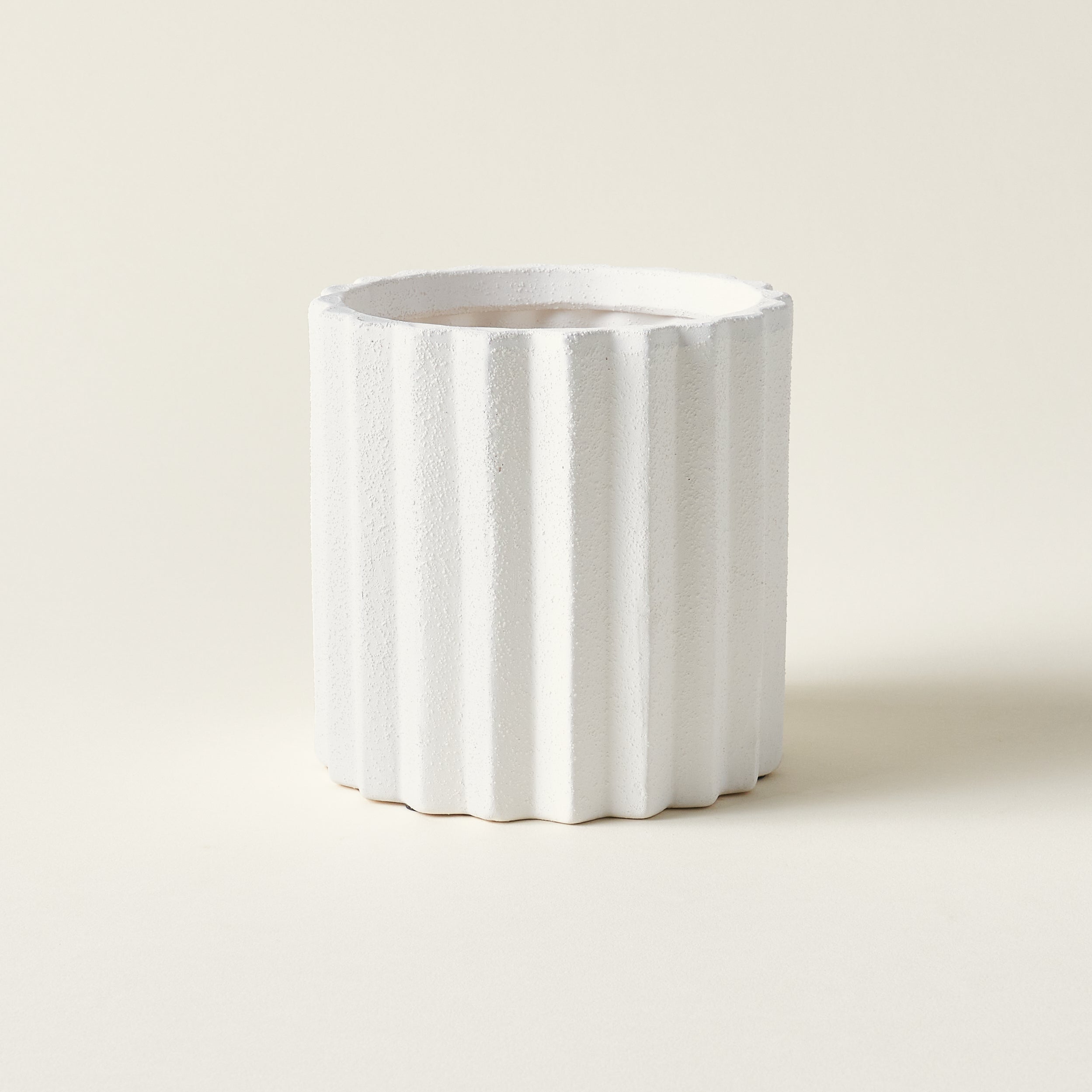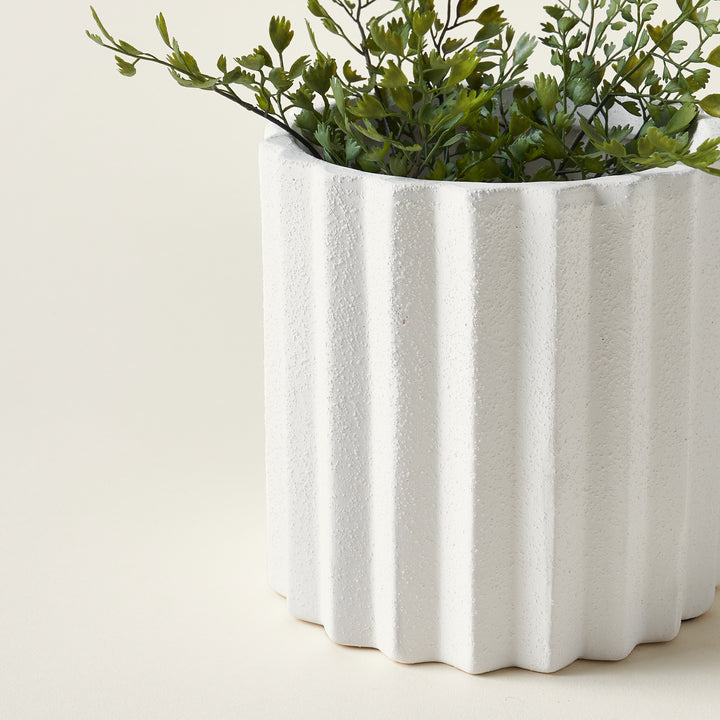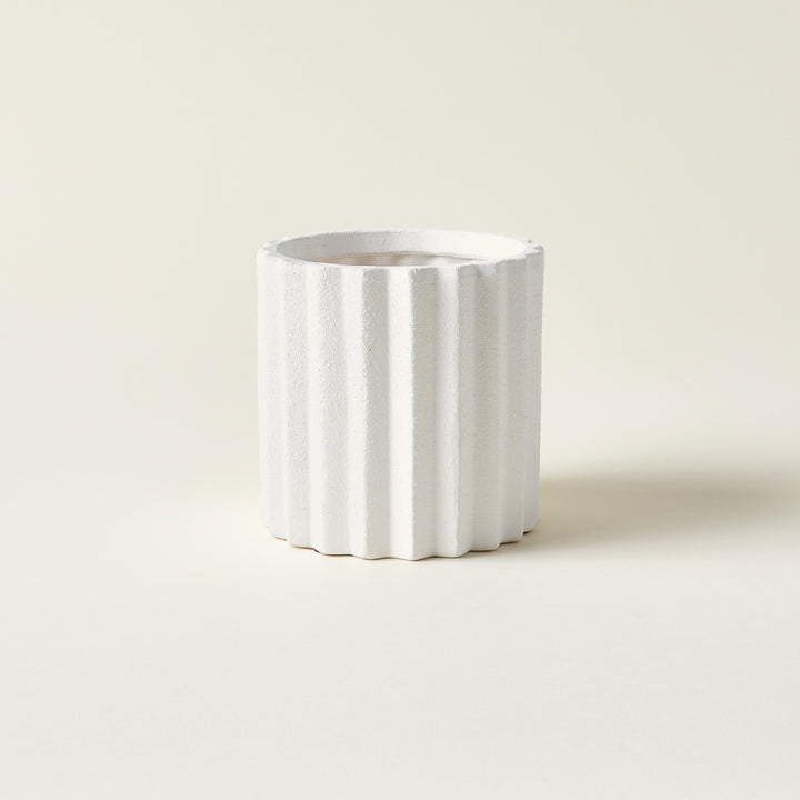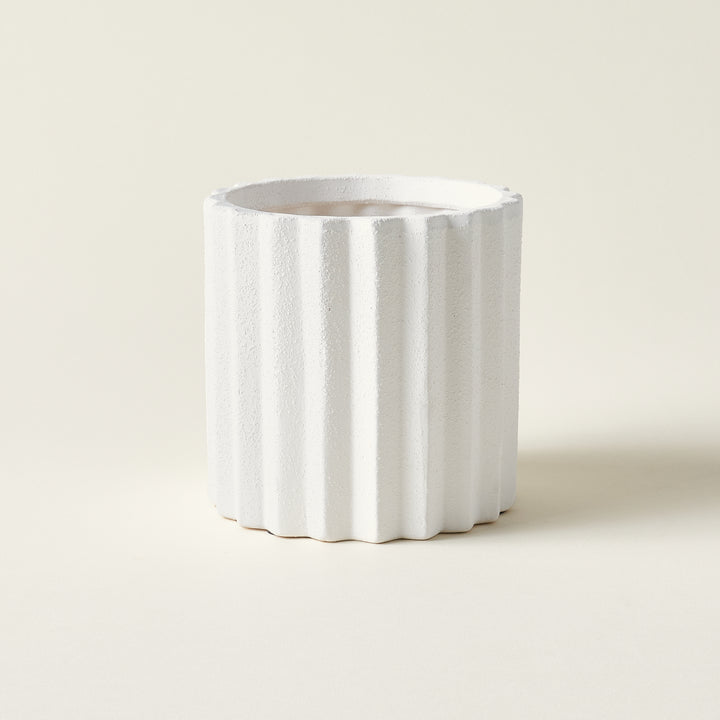 A thoughtful accent for your space, this Monti Planter is a curated piece that brings a sense of serene, sculptural style to your home. Its bright white surface is textured with a beautiful sandy glaze, while delicate vertical flutes create a lovely visual rhythm.