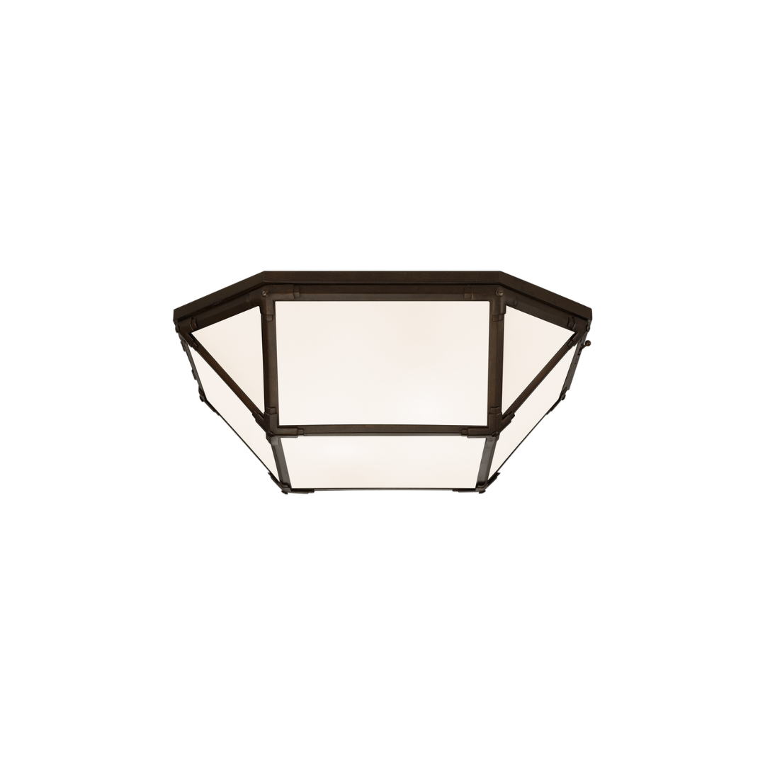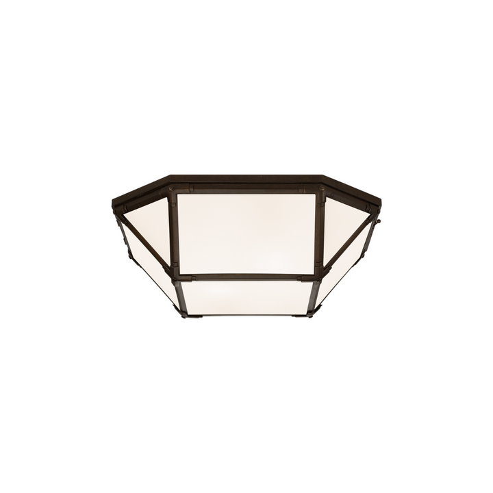 Enhance your kitchen or entryway with the refined charm of the Morris Flush Mount by Suzanne Kasler. The geometric frame, available in antique zinc, is adorned with white glass panes, providing diffused illumination. Elevate your home with this versatile lighting fixture.