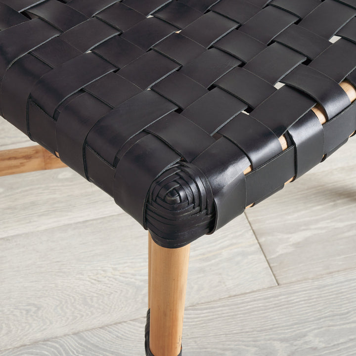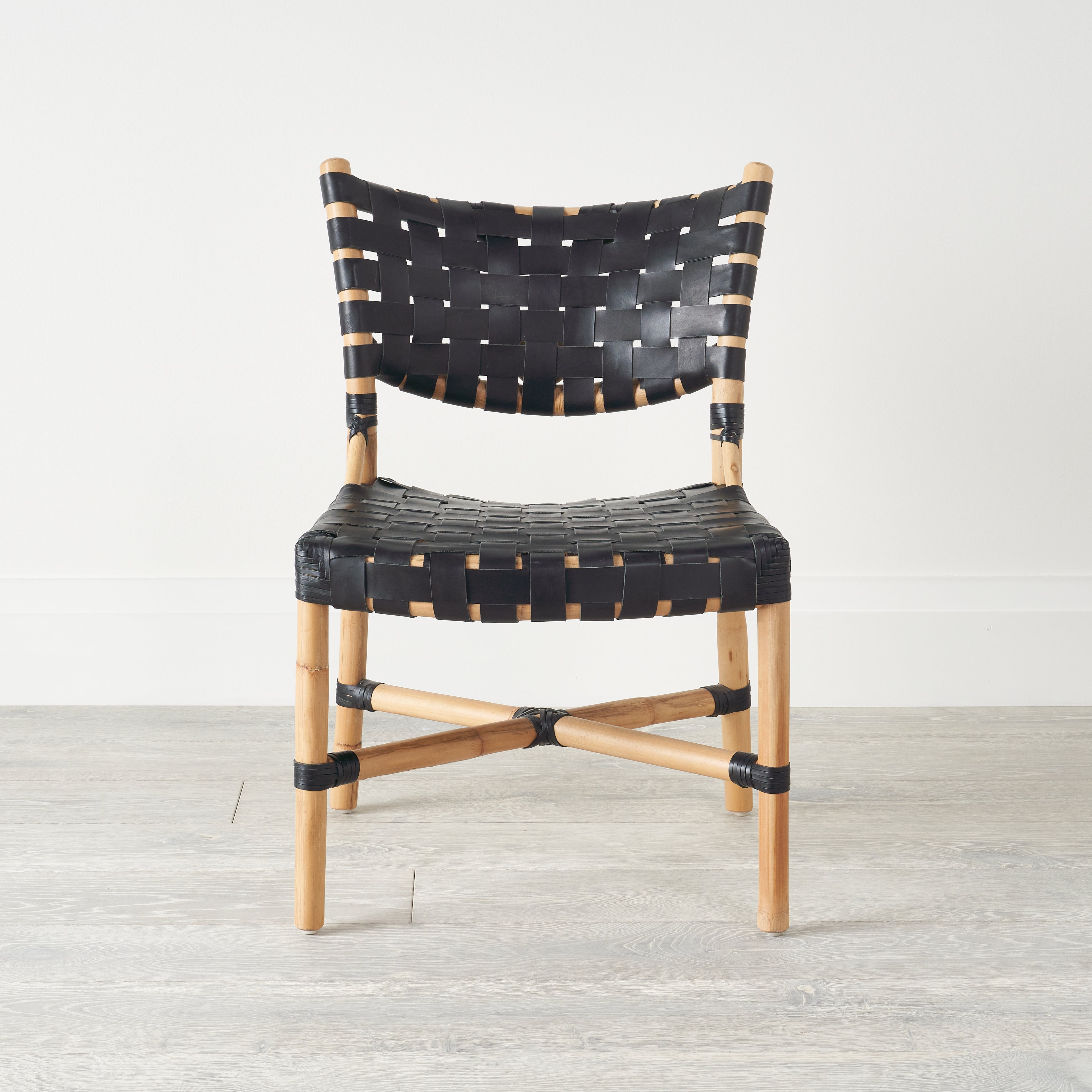 Crafted from black leather straps and natural rattan, the open weave of the Morris Dining Chair contrasts against a curvilinear frame for a stunning dining chair. Leather and Rattan are natural materials. Differences in color and pattern should be expected and celebrated.