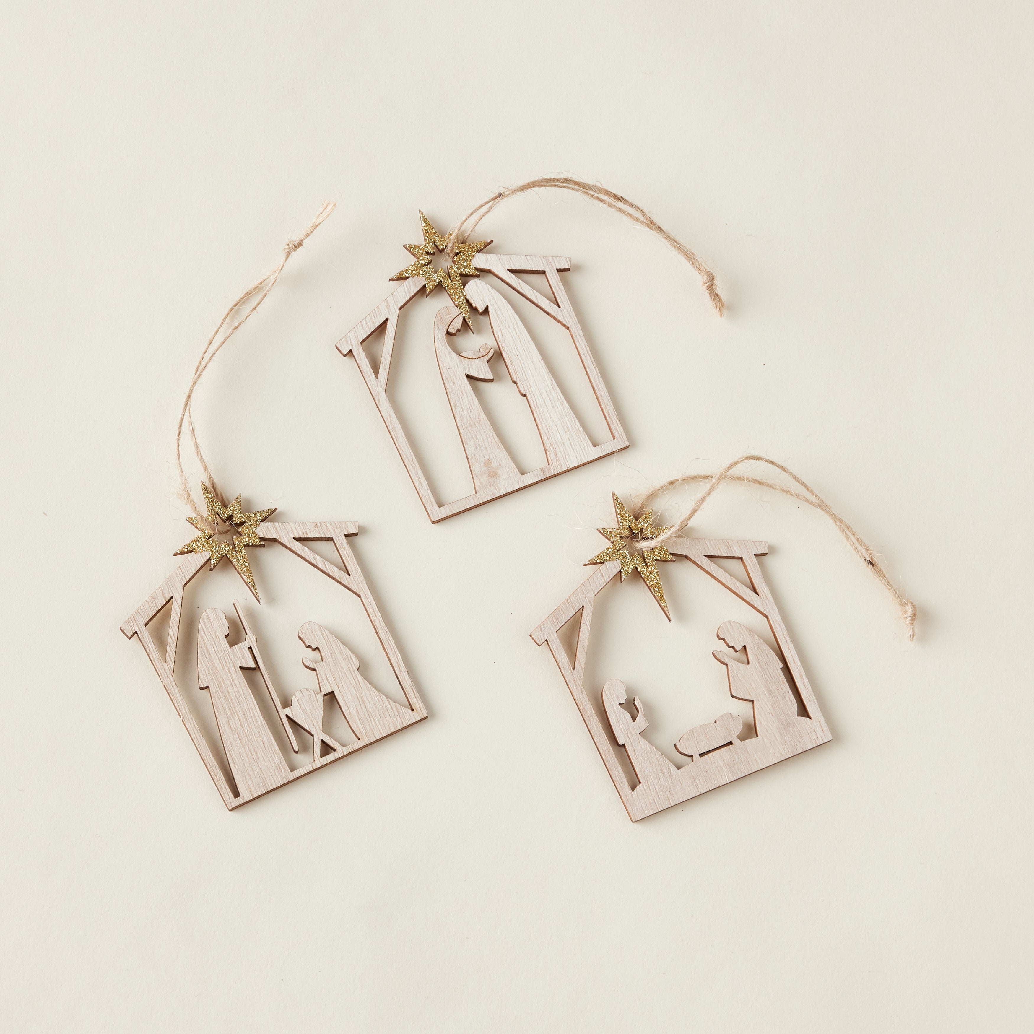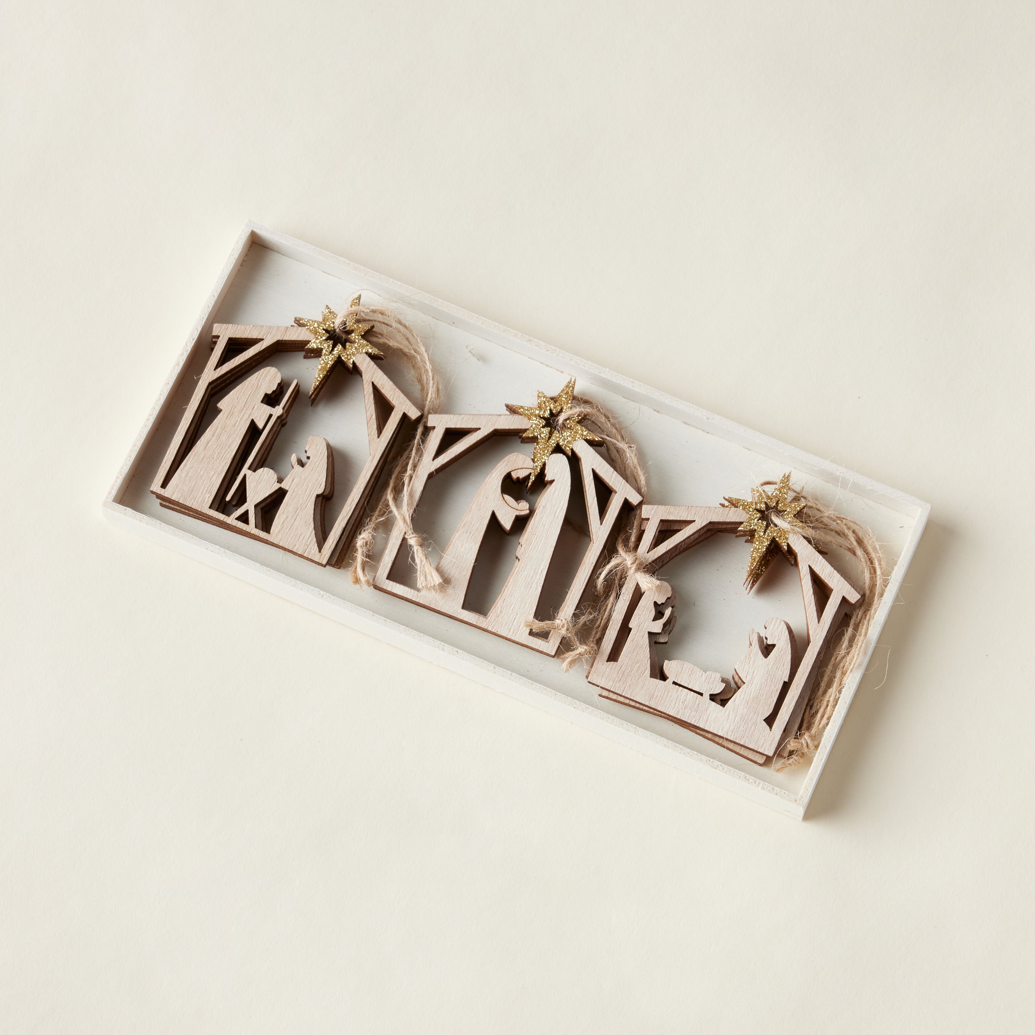 A beautiful way to add timeless charm to your holiday decor. This set of nine Nativity Ornaments is a collection of laser-cut wood ornaments, each topped with a beautiful gold glitter star. Each piece features a unique nativity scene, making this set a thoughtful and stylish way to celebrate the Christmas season. These ornaments are perfect for decorating the tree, adorning table settings, or as a special touch on a gift.