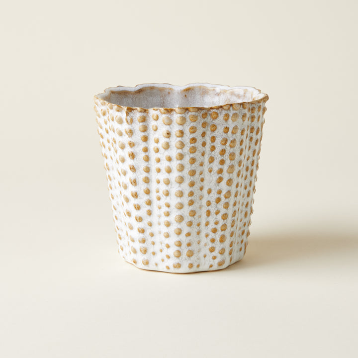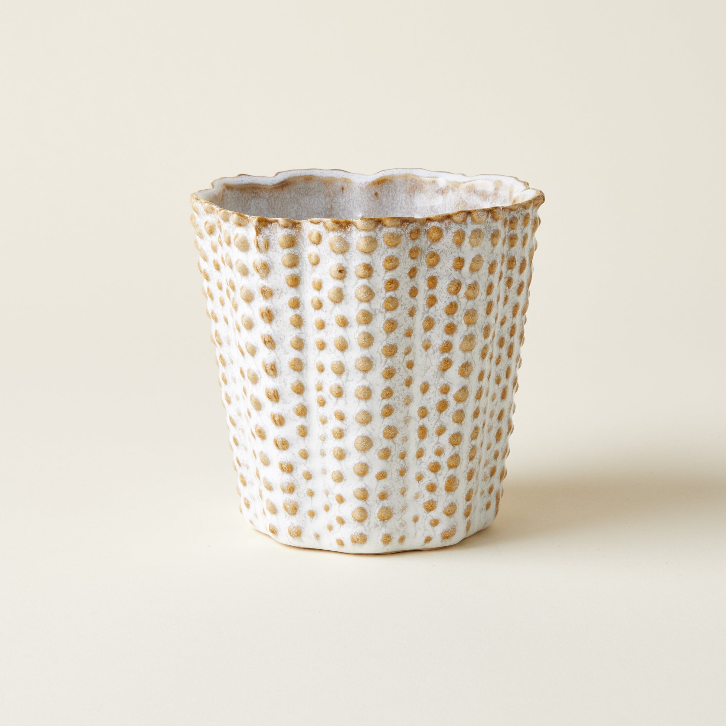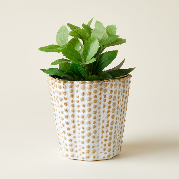 Layer in texture to your home decor with the Nellie Pot. Made of ceramic, this off-white pot features charming dotted accents. Perfect for displaying plants or as a standalone statement piece, this piece elevates any vignette.