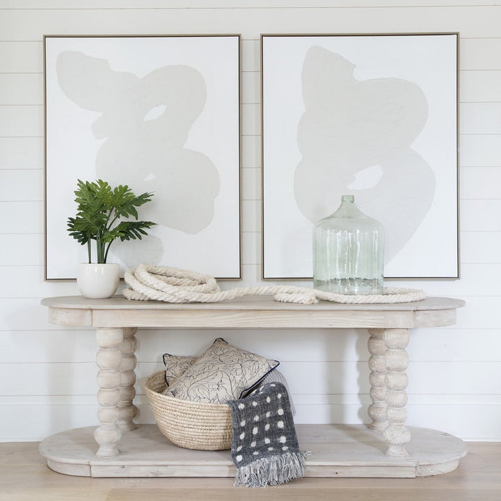 Simple, graphic & neutral. These pieces work well in any space, as a set or alone. Exposed, textured canvas with a grey wood frame.