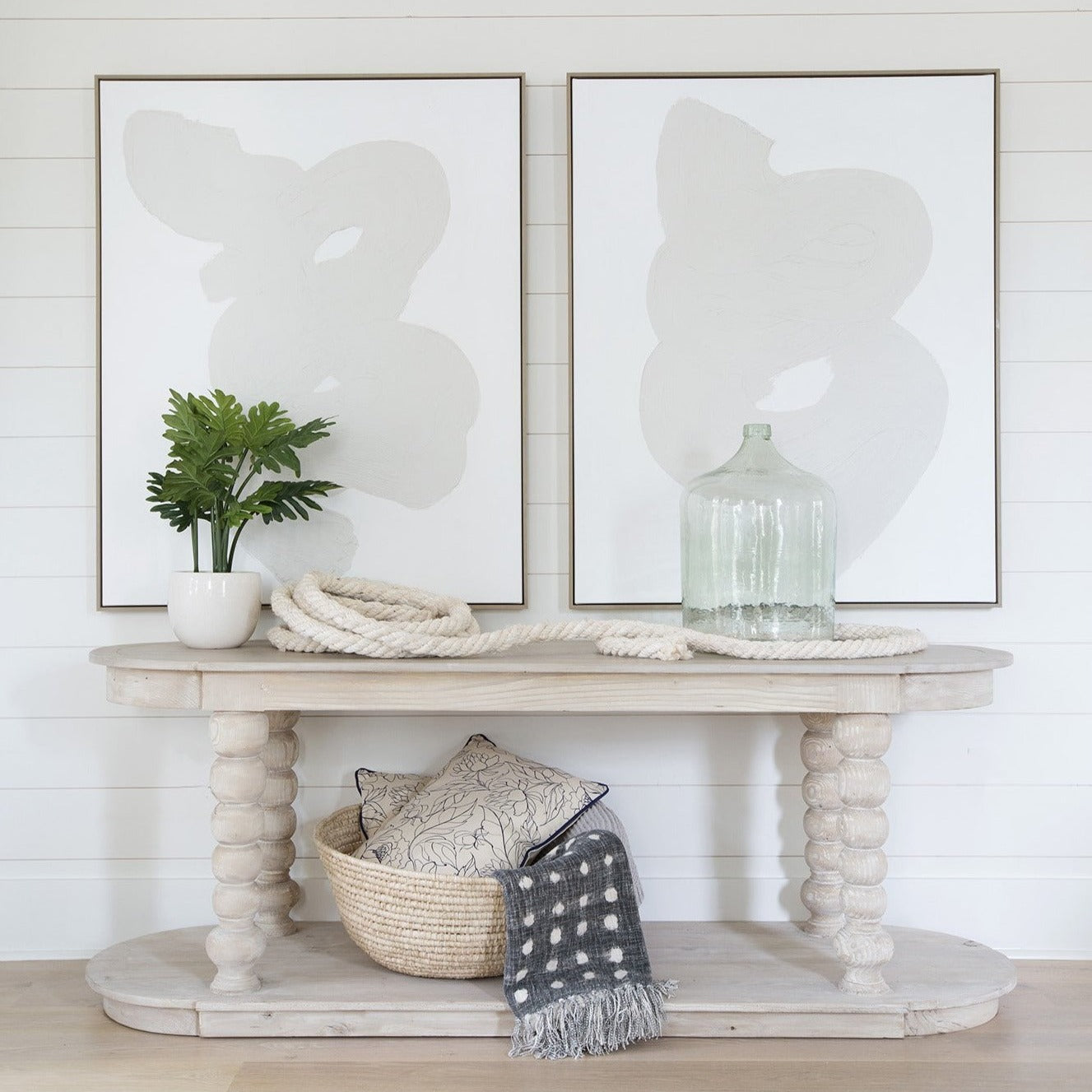 Simple, graphic & neutral. These pieces work well in any space, as a set or alone. Exposed, textured canvas with a grey wood frame.