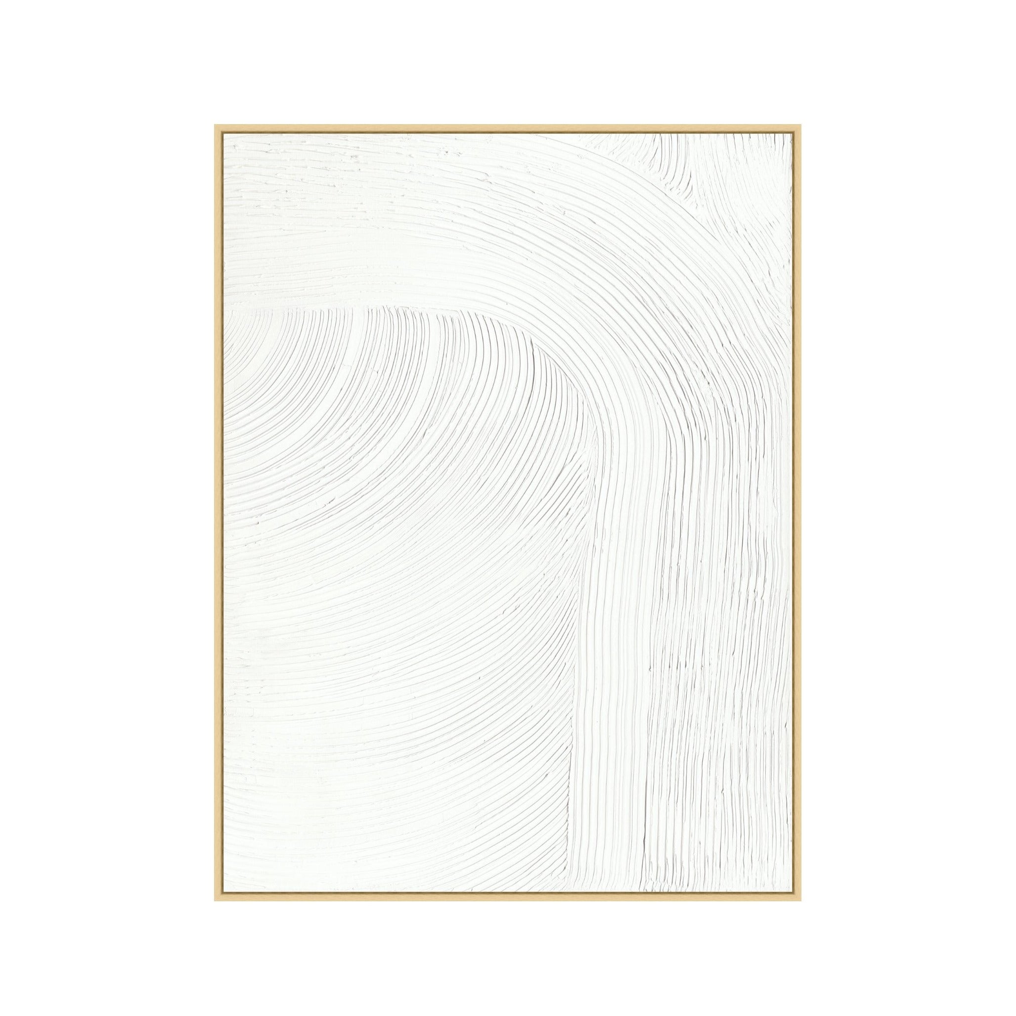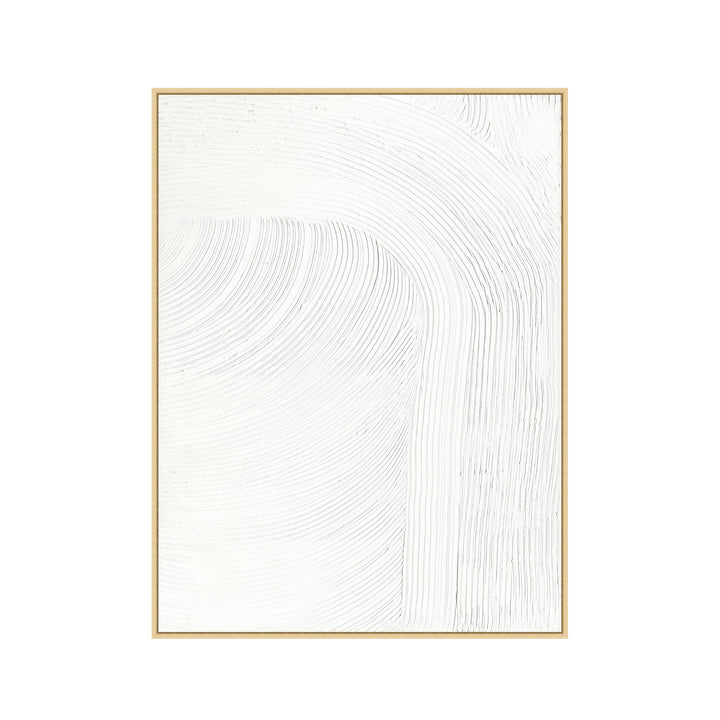 Beautiful and neutral, this hand-painted artwork goes well in any room. Textured gallery wrapped canvas with light wood frame.