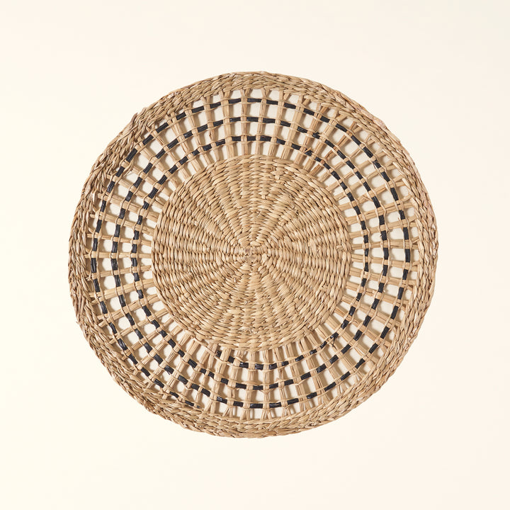 Round placemat made of hand-woven seagrass with black accents.