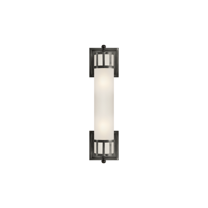 This sconce in bronze with frosted glass works great in a bathroom. Can be installed vertically or horizontally.