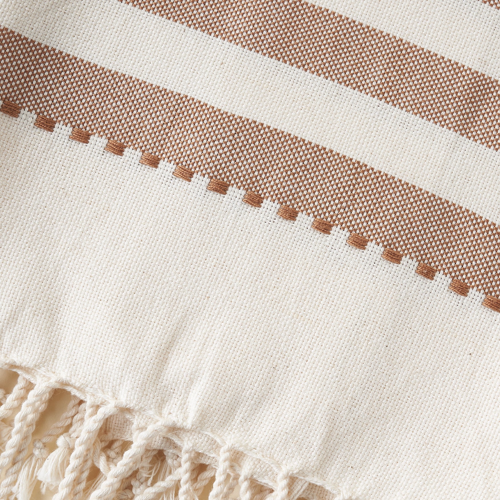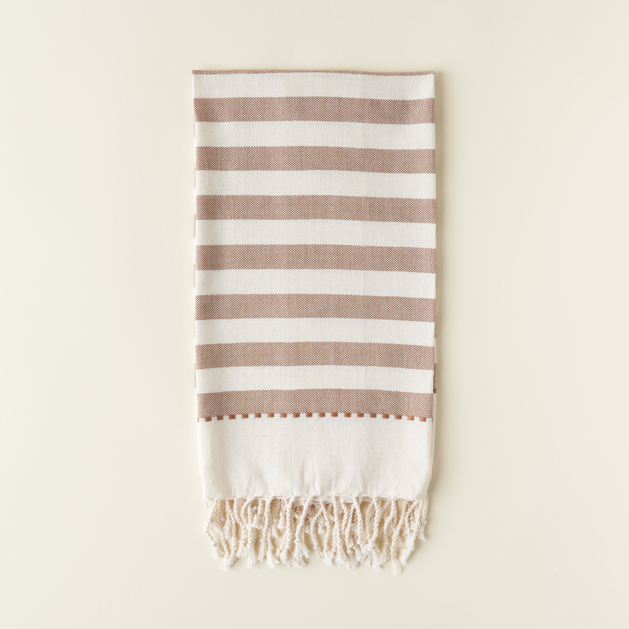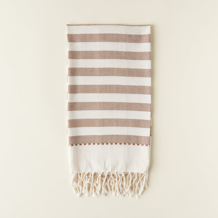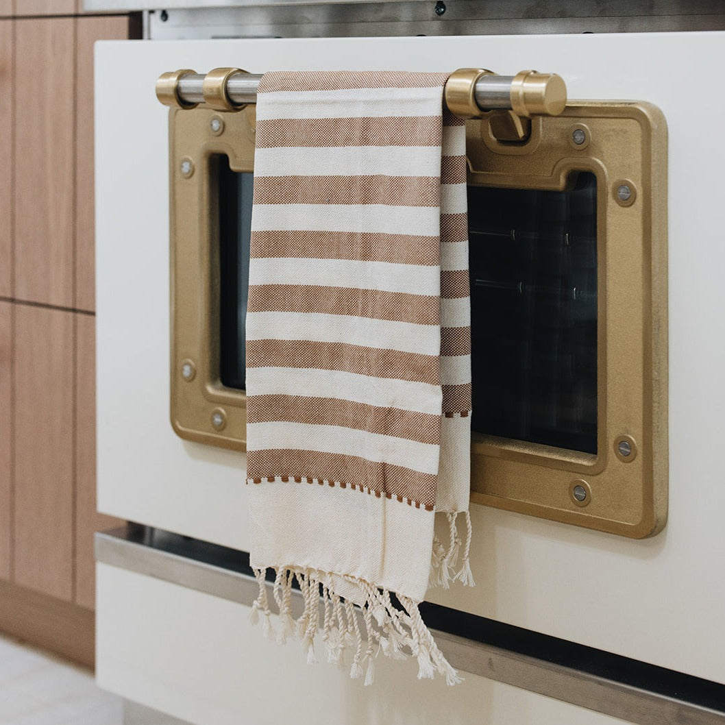 Woven on a pedal loom by women in Guatemala, the Paloma Hand Towel is made from a tight weave, fair trade cotton that is not only absorbent and soft but also lightweight. The wide tan stripes and delicate fringe detail add a touch of art to your kitchen.