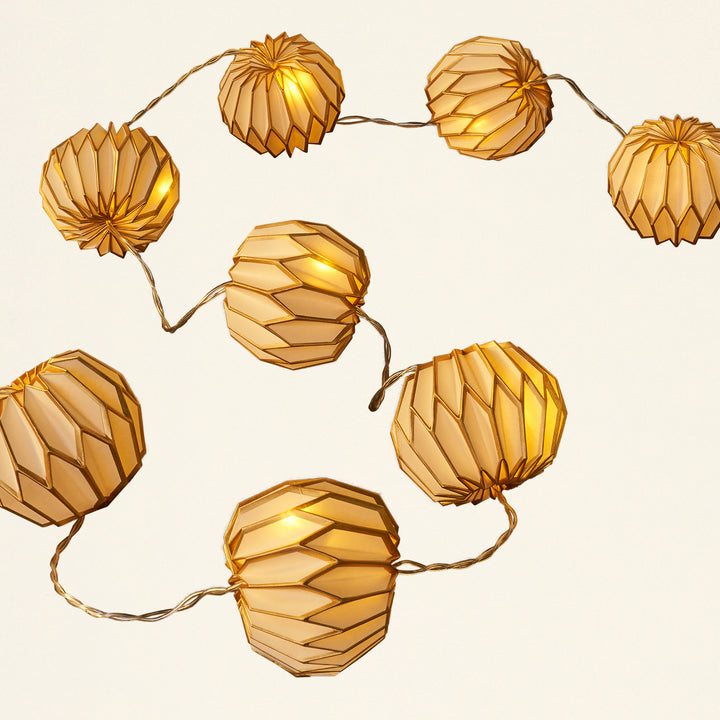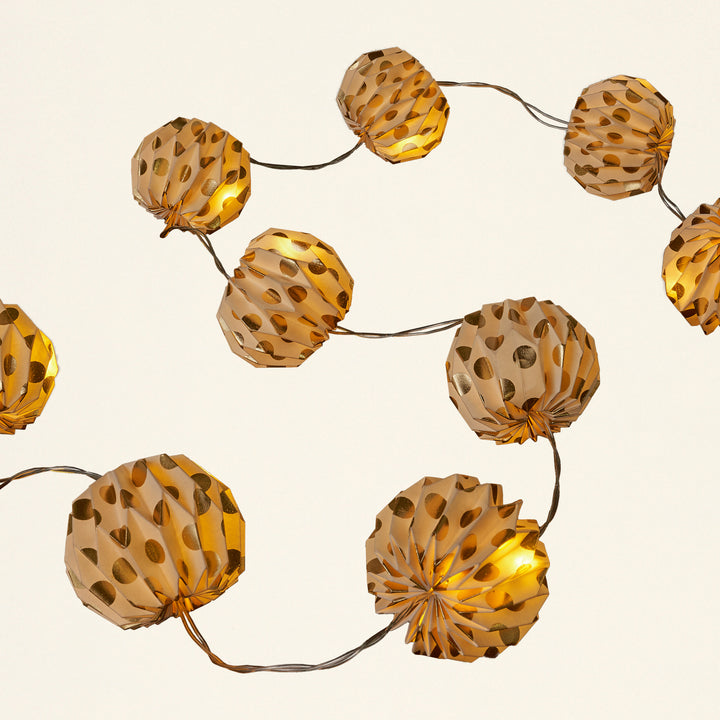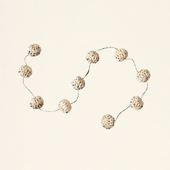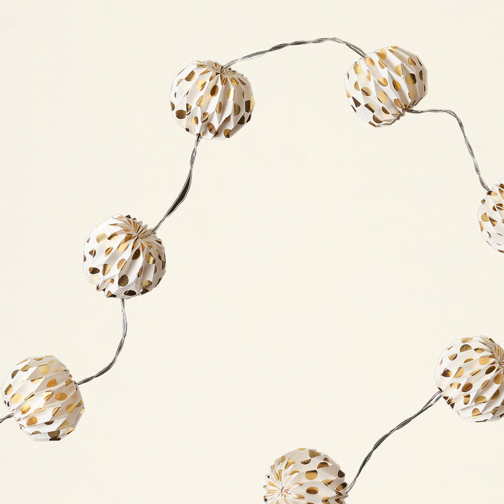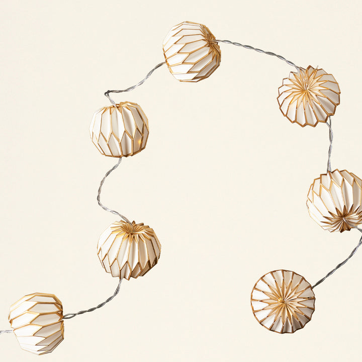 A beautiful way to add cozy, festive lighting to your home. This Paper Garland with LED Lights is a beautiful decorative accent, perfect for adding a touch of ambient light and festive charm to any space. The unique design features beautiful paper shapes in a white and gold color palette, and you can choose from two distinct styles. This garland is a stunning way to add a soft, elegant glow to your mantel, tree, or any decorative display.