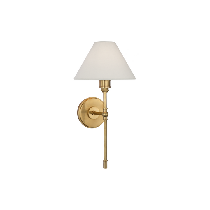 The Parkington Large Tail Sconce from Chapman & Myers combines industrial minimalism with sleek lines for a timeless look. Inspired by classic library lights, it features distinctive architectural molding details with an antique-burnished brass finish and linen shade. Add a touch of sophistication to any room with this elegant piece.