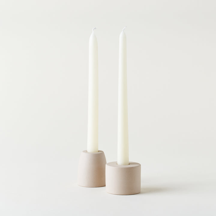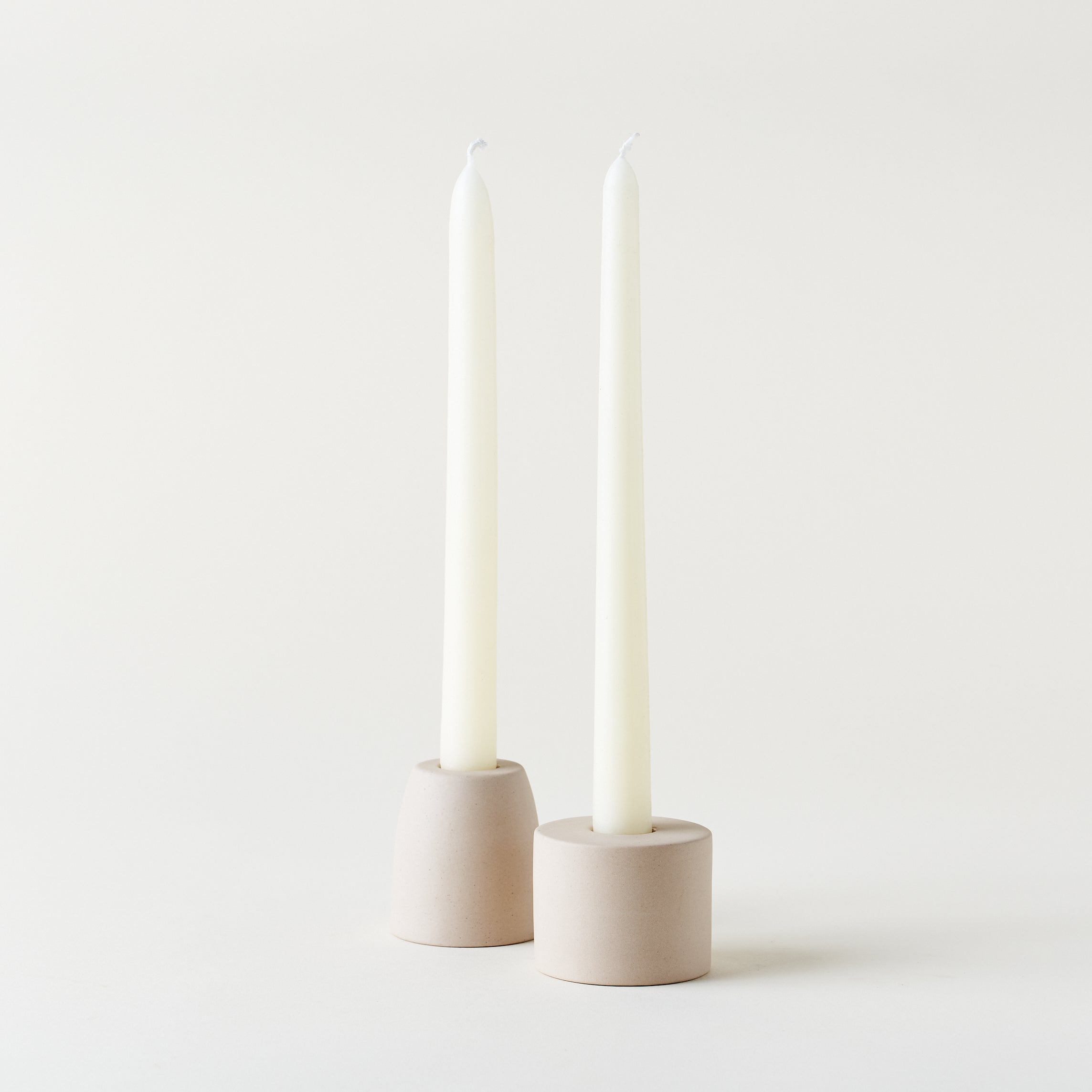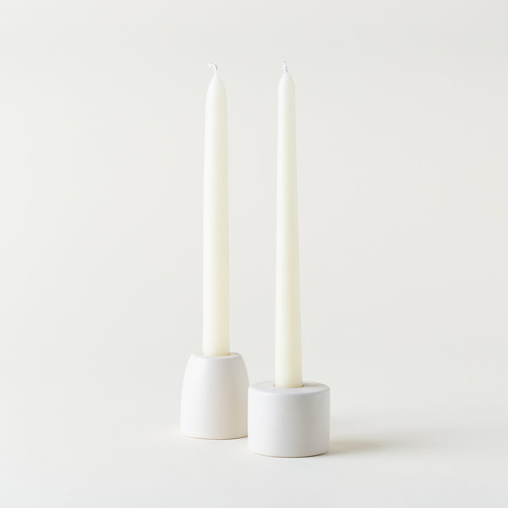 The petite ceramic taper holders complement our taper candles with their matte finish and modern form-a bold collection perfect for everyday use or entertaining. Each holder is sized to fit a standard taper candle. Pair with our fluted tapers or hexagon tapers. Choose between two styles and colors.
