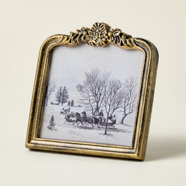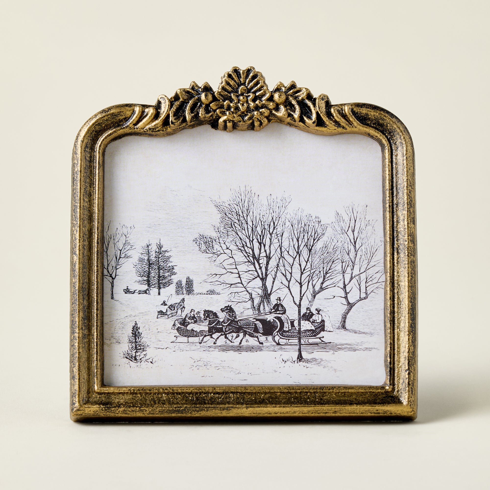 This Petite Open Sleigh Art features vintage sleigh-riding imagery within a sculpted frame finished in a metallic antique wash, delivering a rustic, timeless appeal. Designed for versatility, it can be displayed freestanding on an easel or easily hung using the attached sawtooth hanger. Ideal for seasonal décor, this piece adds a refined, nostalgic touch to your holiday vignettes.