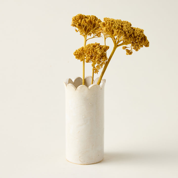 This petite vase is a testament to handcrafted beauty, with a simple cylindrical shape and a distinctive hand-cut scallop top that adds an artistic touch to any setting. Made from ceramic, this vase is a versatile piece that can hold a single flower, a collection of dried stems, or even pencils on a desk. Its refined design is a thoughtfully made addition to your curated home, adding a touch of timeless elegance and sculptural charm.