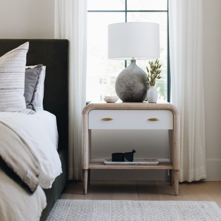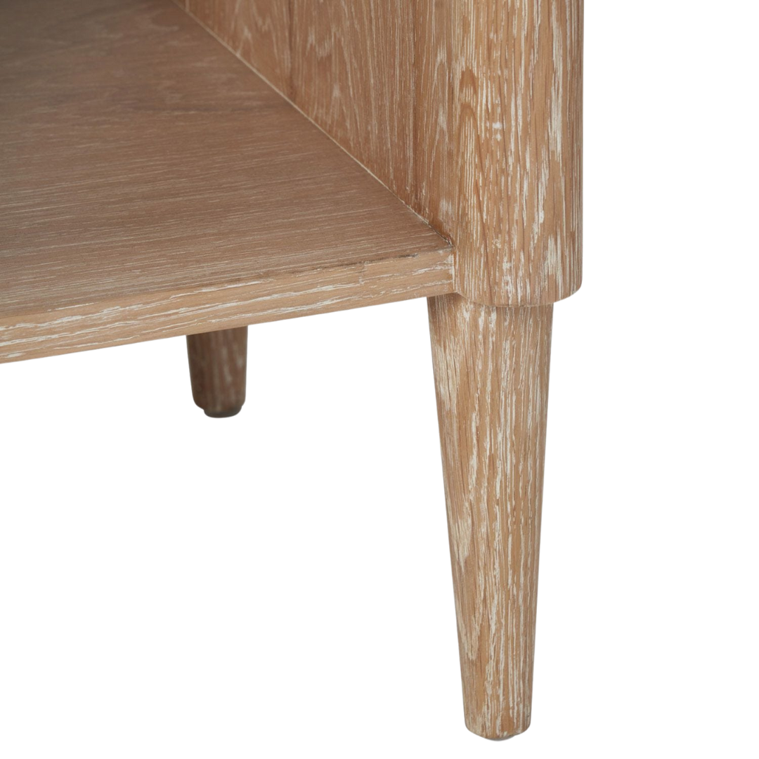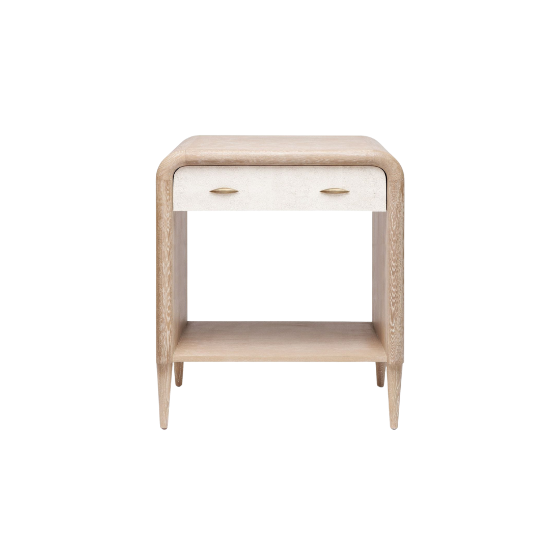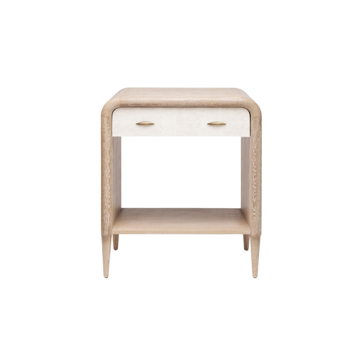 The Pierre Nightstand's rounded frame takes its cue from the late '60s, with Whitewashed oak and vintage faux shagreen drawer panels making it a contemporary beauty. The shape highlights the wood's gorgeous grain and tapered legs provide a shapely finish.