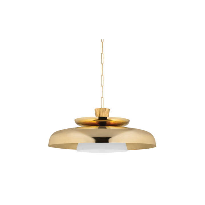 The Ravenna Pendant showcases a refined architectural silhouette with its signature stacked shallow bowl layers, culminating in a luminous opal glass shade beneath a sleek metal canopy. Accented by a subtly ribbed cap and finished in rich Vintage Brass, this design balances organic texture with sophisticated glamour, making it an enduring statement piece for any interior.
